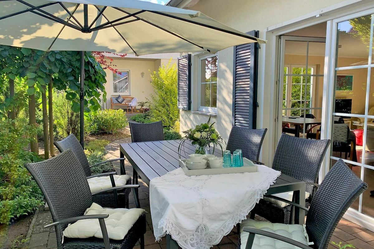 Mehrere Terrassen direkt am Haus bieten Ihnen die Gelegenheit, je nach Stand der Sonne draussen zu sitzen. Die passenden Terrassenmöbel, ein Elektrogrill und sogar ein Strandkorb zum Einkuscheln sind vorhanden. Ein Spielplatz mit Wikingerschiff für Kinder befindet sich direkt im Garten. Die Balkon- bzw. Terrassenmöbel stehen saisonal - in der Regel von Mai bis Ende September - zur Verfügung.