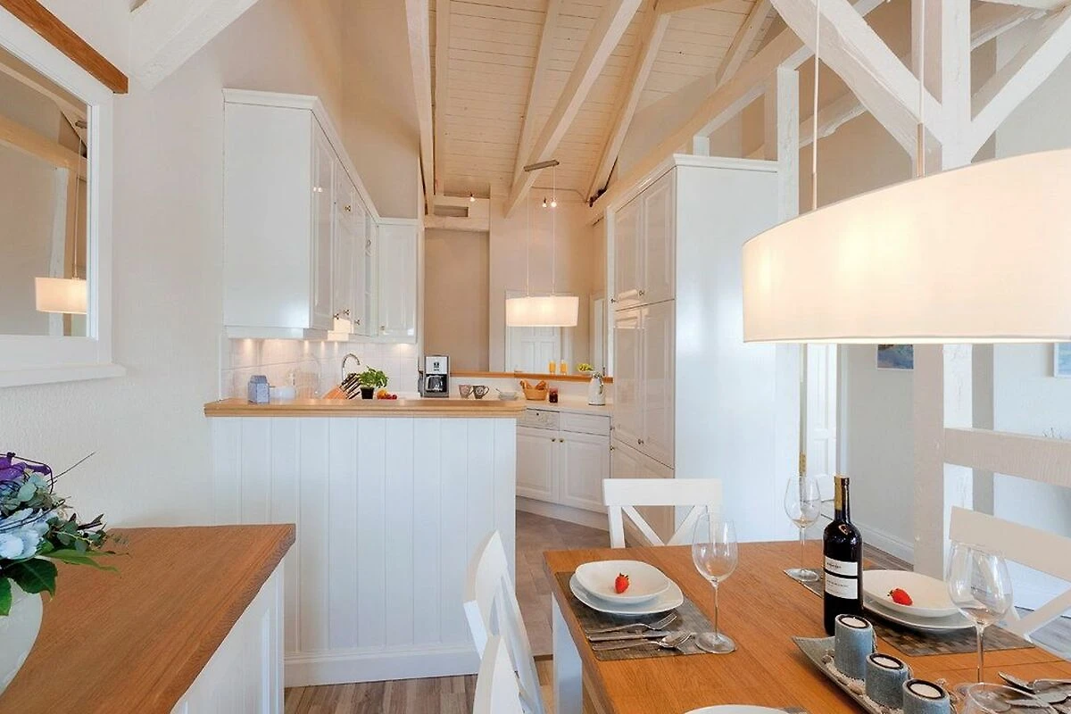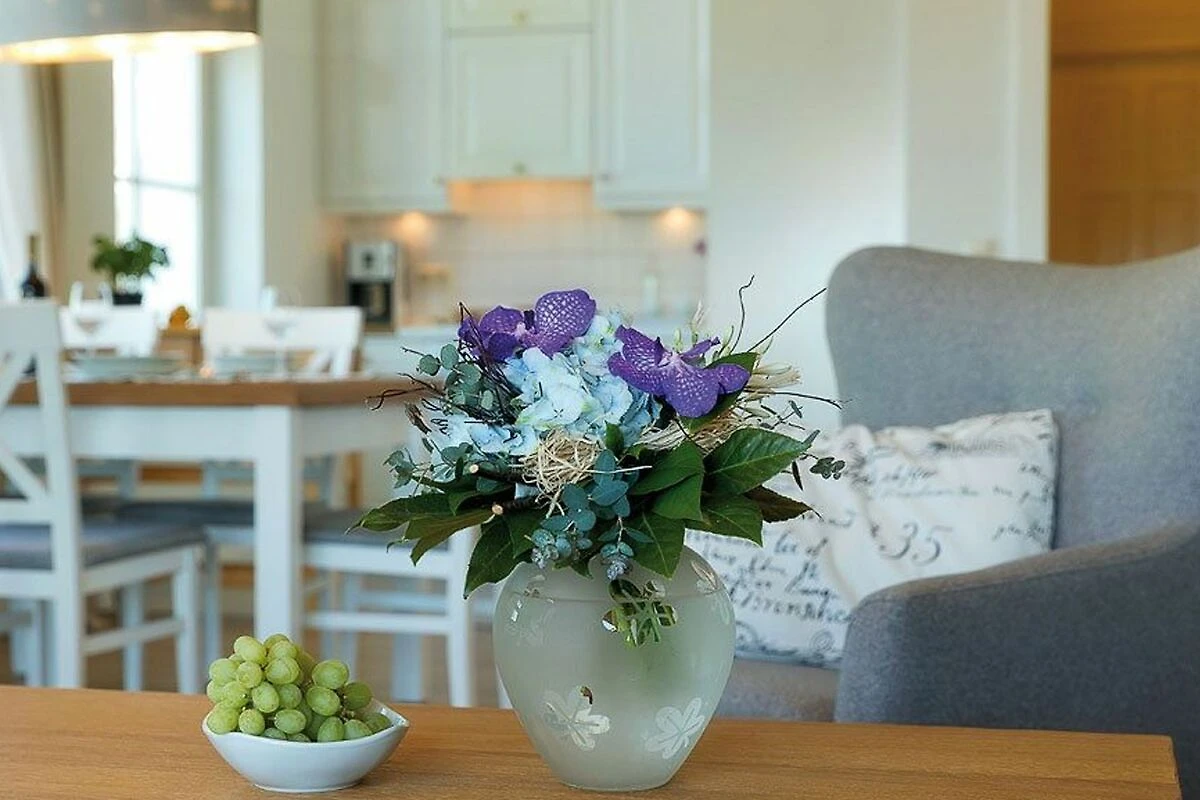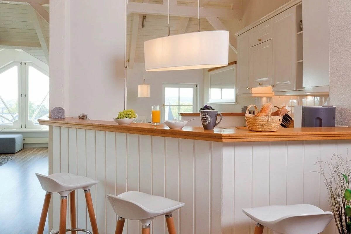 In dem grosszügigen kombinierten Wohn- Koch- und Essbereich wartet eine gemütliche Sitzecke mit TV, Blurayplayer uvm. zum Entspannen auf Sie sowie eine vollausgestattete Küche mit allen Raffinessen (Geschirrspüler, Kühlschrank mit Gefrierfach, Waschmaschine, Wasserkocher, Toaster, Kaffeemaschine, Mikrowelle) sowie ein Essplatz für 6 Personen. Highlight des Appartements ist die grosse Fensterfront des Wohnzimmers, die einen tollen Blick auf das Heringsdorfer Meer und über die Dächer von Heringsdorf bis nach Bansin gewährt. Geniessen Sie von dort mit einem spannenden Buch die einzigartige Wirkung des Meeres.