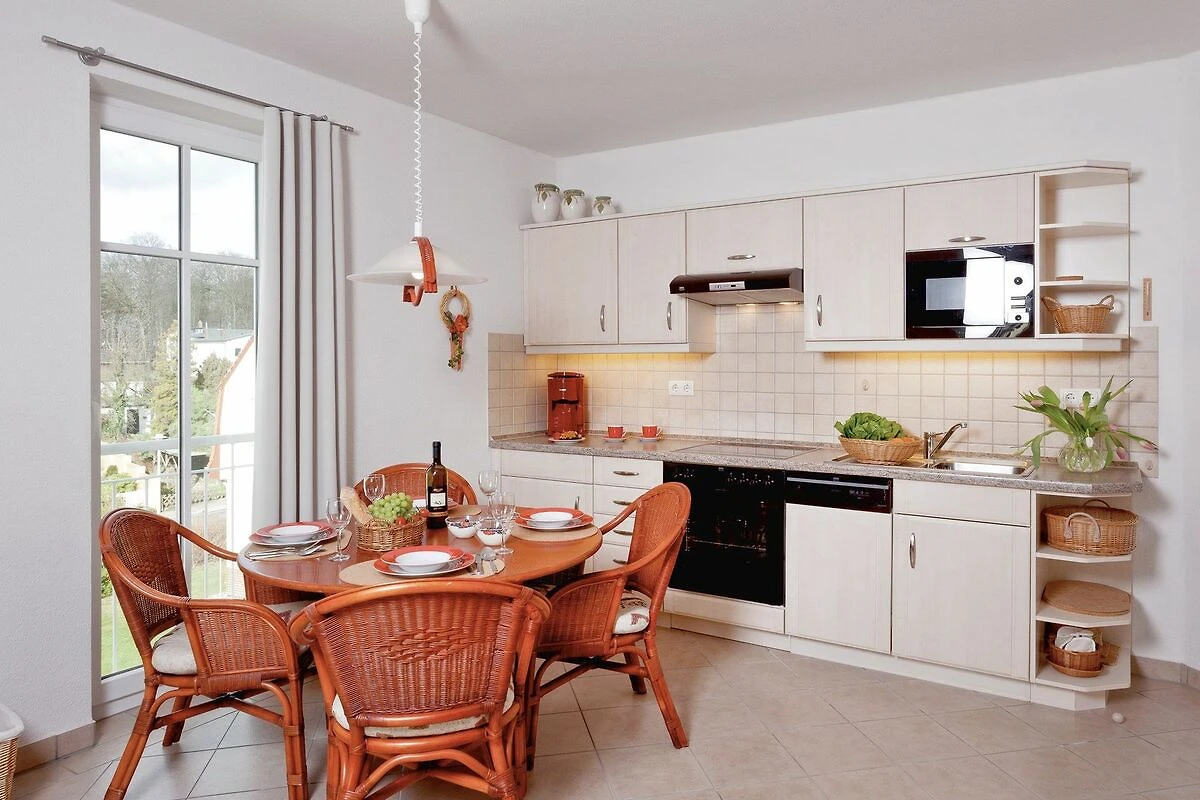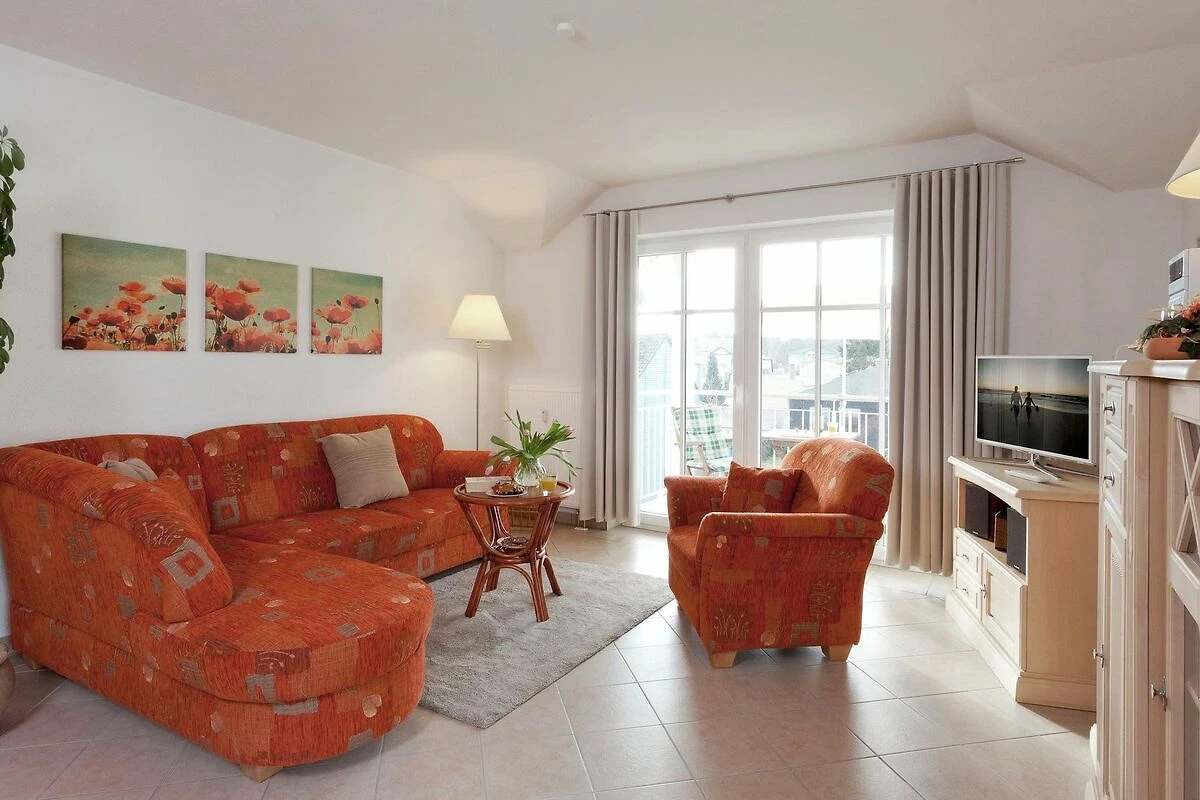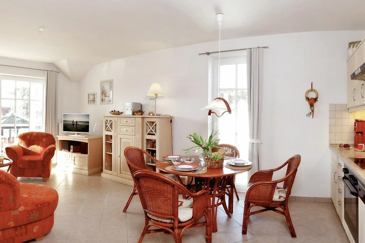 Hell und zugleich freundlich eingerichtet erwarten Sie auf 65m² alle Annehmlichkeiten für einen Urlaub mit bis zu vier Personen und einem Kleinkind im Alter bis zu zwei Jahren. Mit Liebe zum Detail eingerichtet begrüsst Sie der gemütliche Wohn-, Koch- und Essbereich in warmen Tönen. Die integrierte Küchenzeile bietet Dank Geschirrspüler, Kühlschrank mit Gefrierfach, Backofen, Mikrowelle, Wasserkocher, Toaster, Kaffeemaschine und vielen Extras jeglichen Kochkomfort für die Zubereitung Ihrer Lieblingsspeisen. Ein bequemes Sofa, ein Sessel, Flat-TV sowie ein Esstisch für vier Personen laden zum Entspannen und geselligem Beisammensein ein.