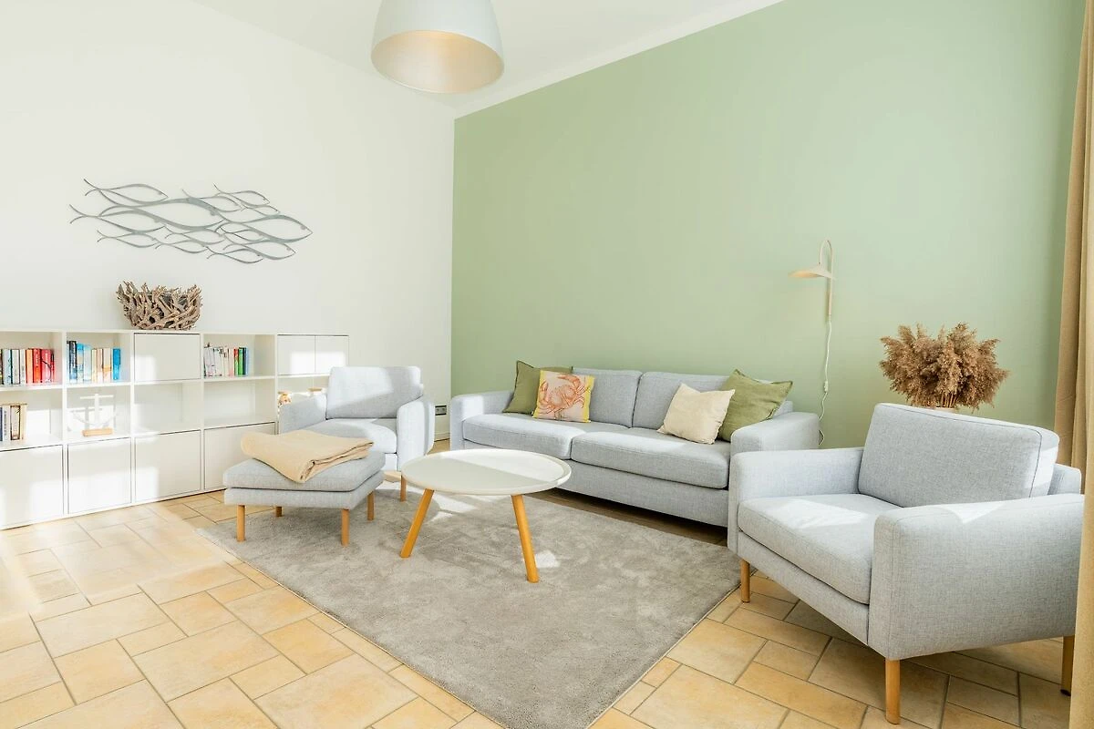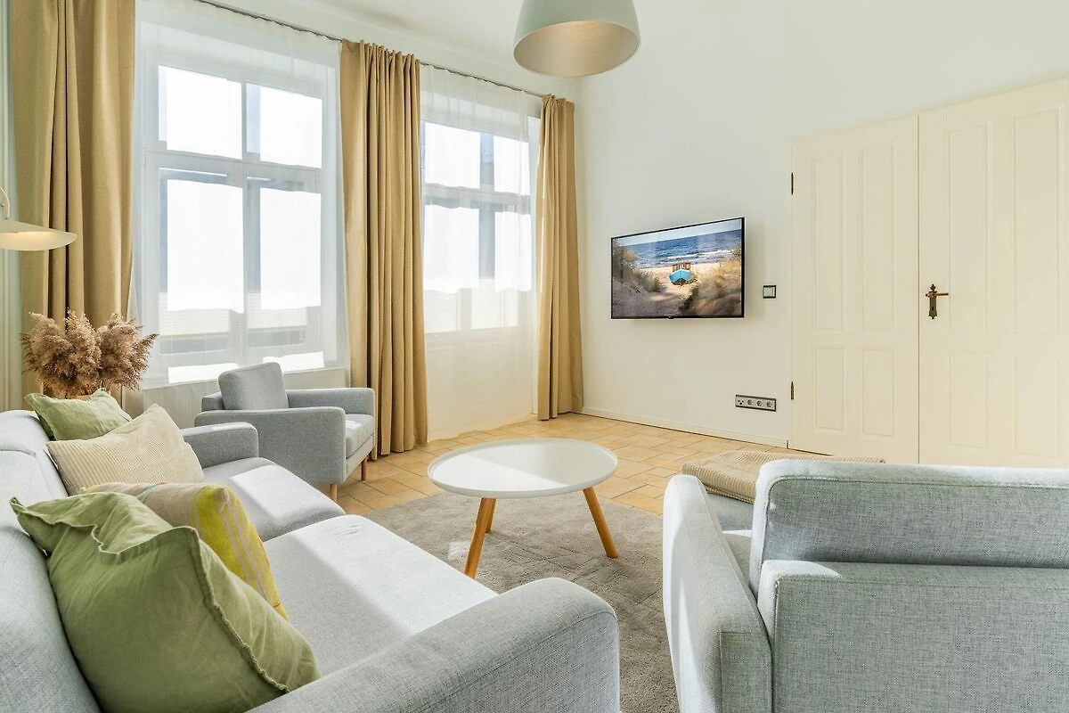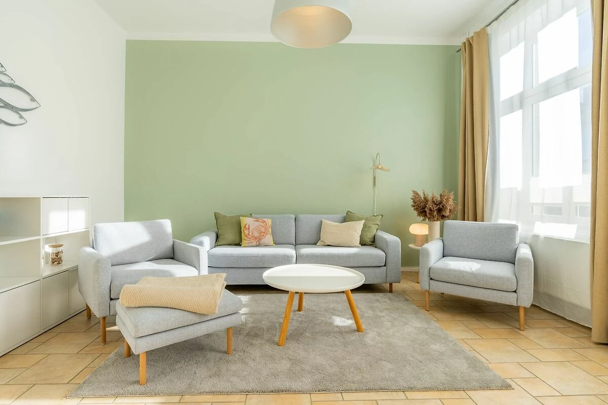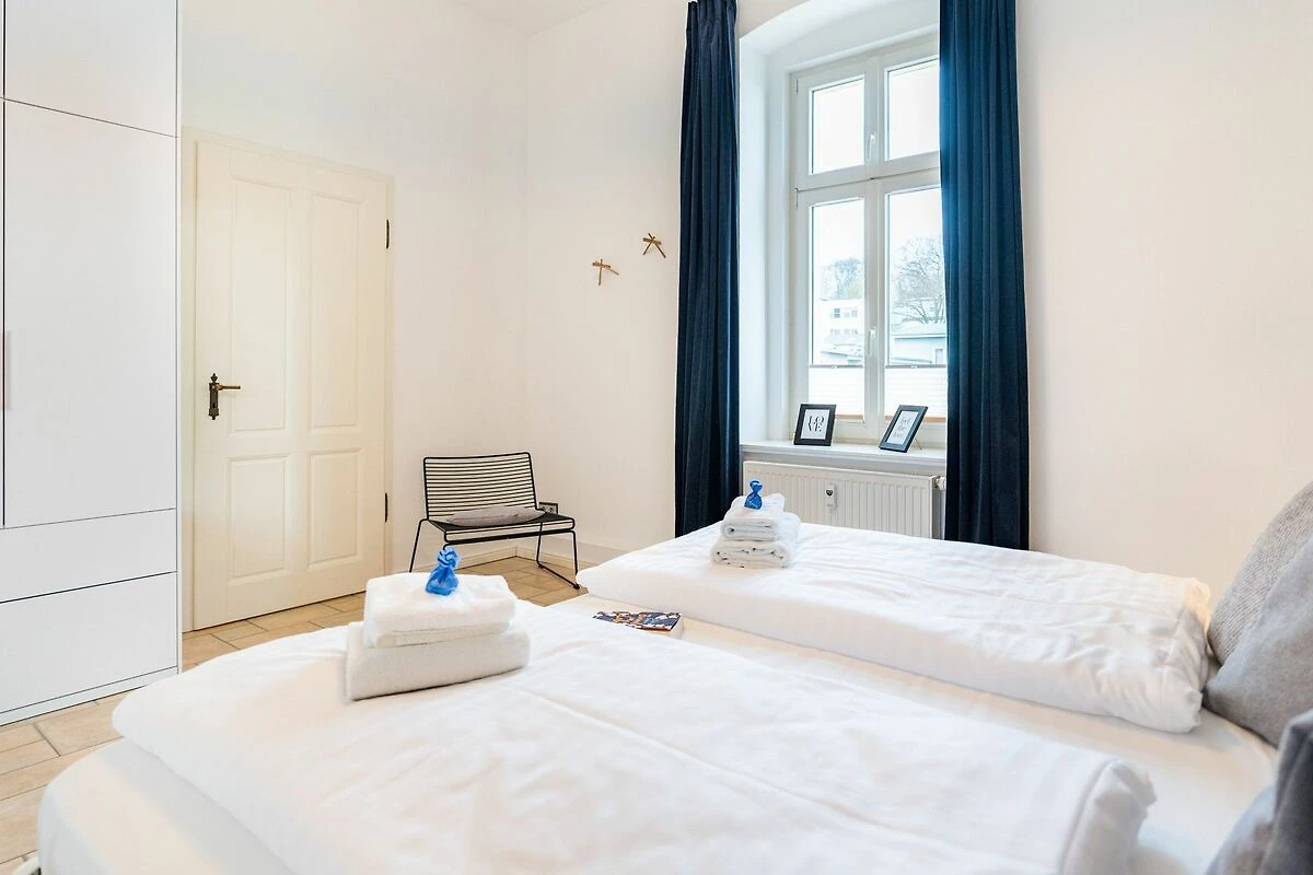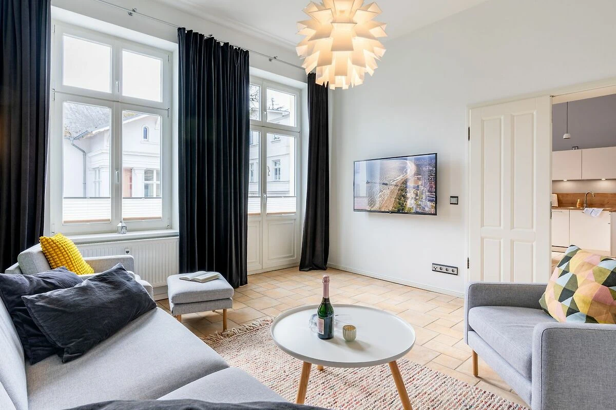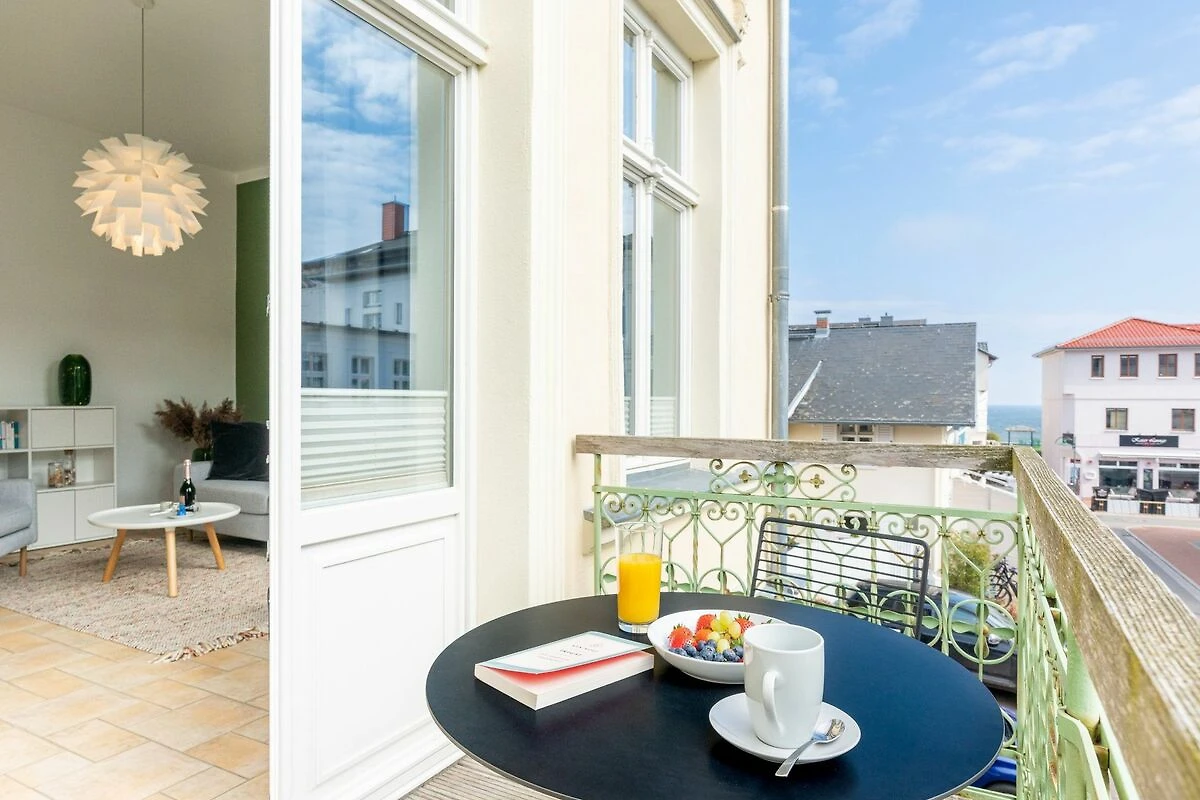 Im 1. OG der Villa Monico gelegen, hat sie einen schönen Süd-Ost-Balkon von welchem Sie aus schon morgens beim ersten Kaffee einen Blick auf die Ostsee werfen können. Bei der Renovierung ist Wert auf hochwertige Designmöbel sowie eine geschmackvolle Atmosphäre gelegt worden. Ideal zum Relaxen ist das geräumige und helle Wohnzimmer, welches Sie durch eine Doppelflügeltür betreten. Von der bequemen Sitzgruppe, oder dem Liegesessel aus haben Sie Blick auf den grossen Flat TV (55 Zoll). Ein kostenloser Netflix-Zugang ist bereits enthalten und bietet somit auch an grauen Herbsttagen eine schöne Abwechslung.