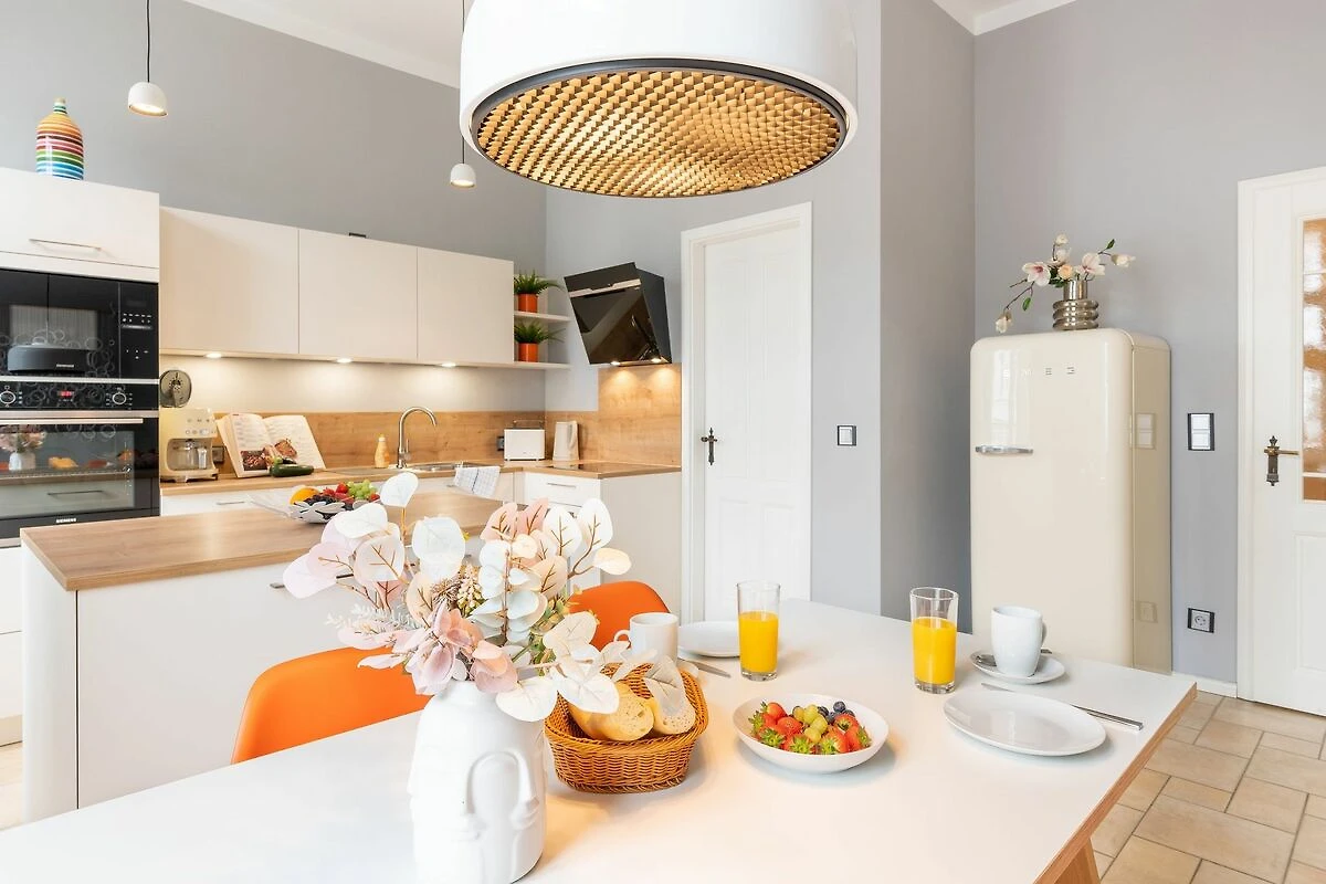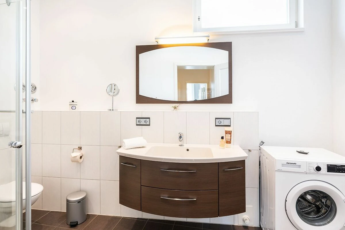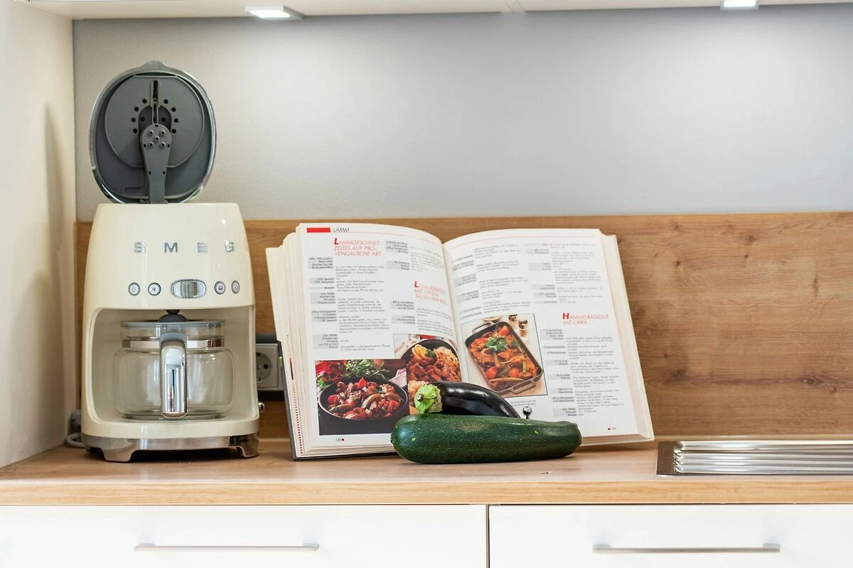 Die neue Küche mit Arbeitsinsel ist mit modernsten Geräten (Mikrowelle, Herd, Backofen, Geschirrspüler) sowie umfangreichen Kochutensilien und Geschirr ausgestattet. Hier schlagen die Herzen von Hobbyköchen höher, denn es gibt ausreichend Platz zur Zubereitung Ihrer Lieblingsspeisen. Optisches Highlight der Küche ist der freistehende SMEG-Kühlschrank. In der Küche befindet sich ebenfalls ein schöner Esstisch mit vier Stühlen. Ein stylisches Lampendesign sorgt dafür, dass es Ihnen nie zu dunkel wird. Pures Schlafvergnügen finden Sie im Schlafzimmer. Dieses bietet Ihnen ein hochwertiges Doppelbett (1,80 m x 2,00 m) und einen Kleiderschrank. Eine weitere Schlafgelegenheit für bis zu zwei Personen finden Sie auf dem Design-Schlafsofa (1,60m x 2,10m) im Wohnzimmer, welches eine robuste und einfache Ausklappfunktion und einen echten Lattenrost bietet. Das Tageslichtbad verfügt über eine ebenerdige Dusche, einen Waschtisch, einem WC und einer Waschmaschine ausgestattet.