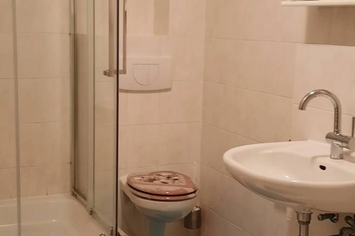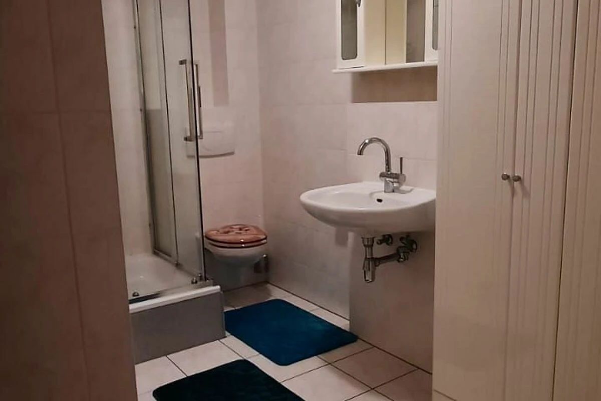 Eckdusche, Waschbecken, Toilette, Spiegelschrank, Schrank, Staubsauger, Wischeimer
