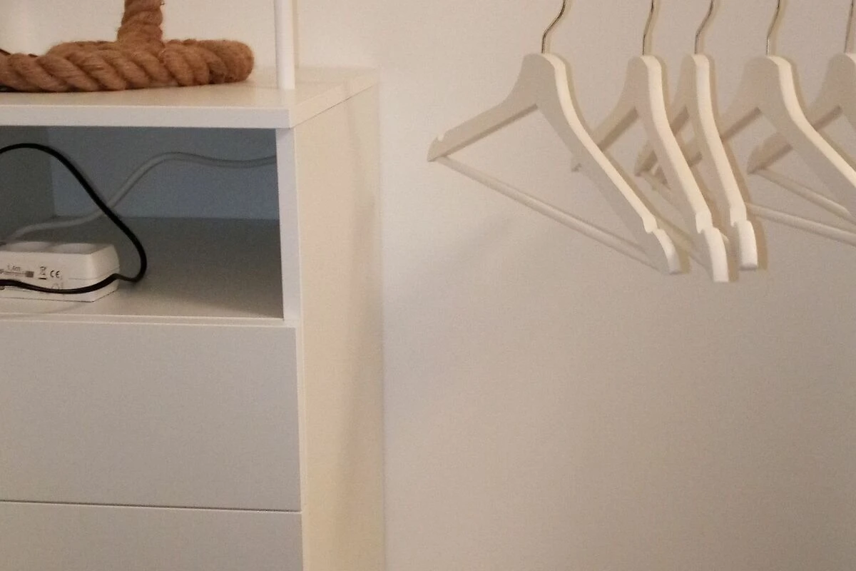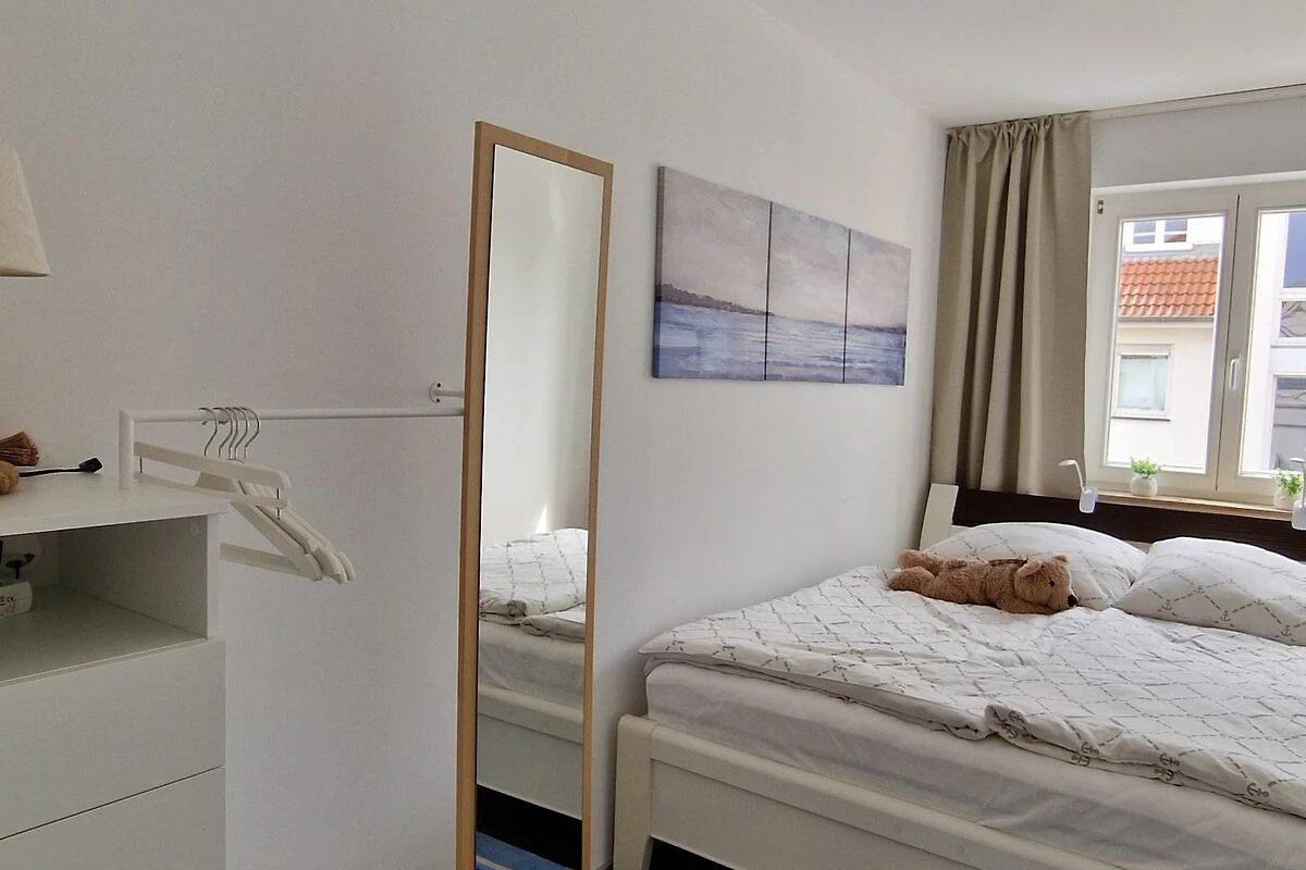 Doppelbett mit durchgehender Matratze 1,80x200 cm, Kommode, Garderobe mit Spiegel, 2 Leselampen