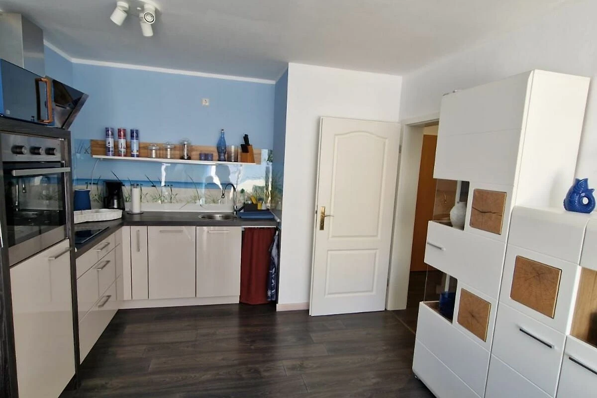 Essbereich für 2 Personen, offen zum Wohnzimmer, komplett eingerichtete Einbauküche mit Backofen,