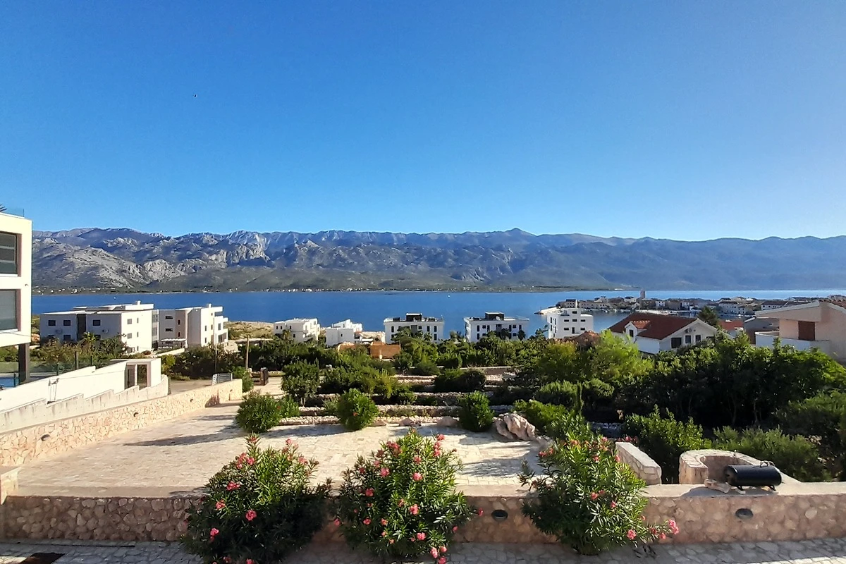 Die Wohnung hat eine Terrasse mit traumhaftem Blick zum Meer, bis zu dem dahinter gelegenen Velebit- Gebirge. ( Paklenica Nationalpark.)