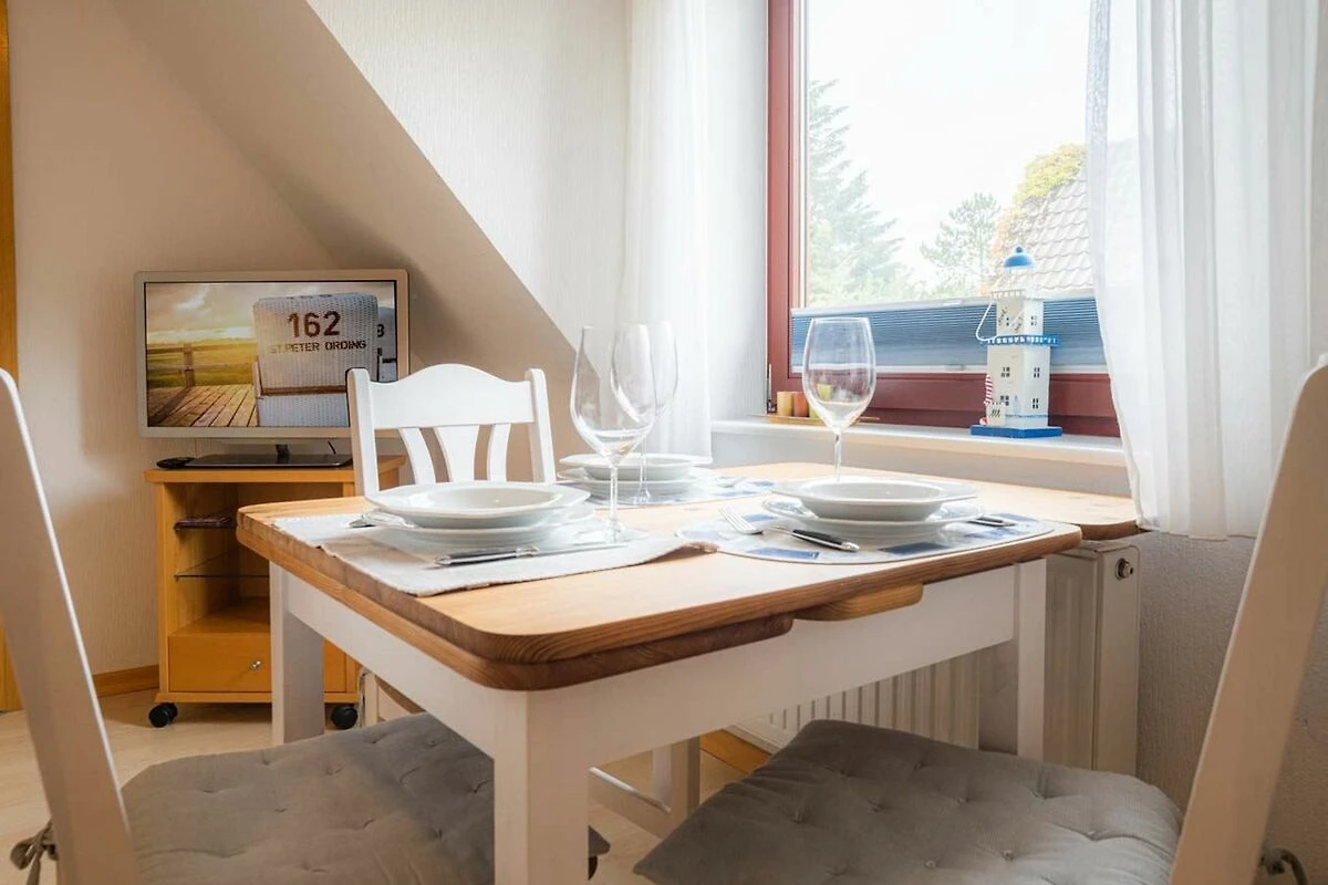 Gemütliche, einfache 2-Zimmer-Ferienwohnung Steuermannskajüte im Haus Seewolf mit ca. 41 m² auf 1 Ebene (OG) für bis zu 3 Personen. In ruhiger Lage nahe der Einkaufsstrasse im Ortsteil Dorf in St. Peter-Ording. Alle Geschäfte, Restaurants und Bäckereien sind fussläufig bequem erreichbar. Zwei Hunde sind nach Anmeldung herzlich willkommen.