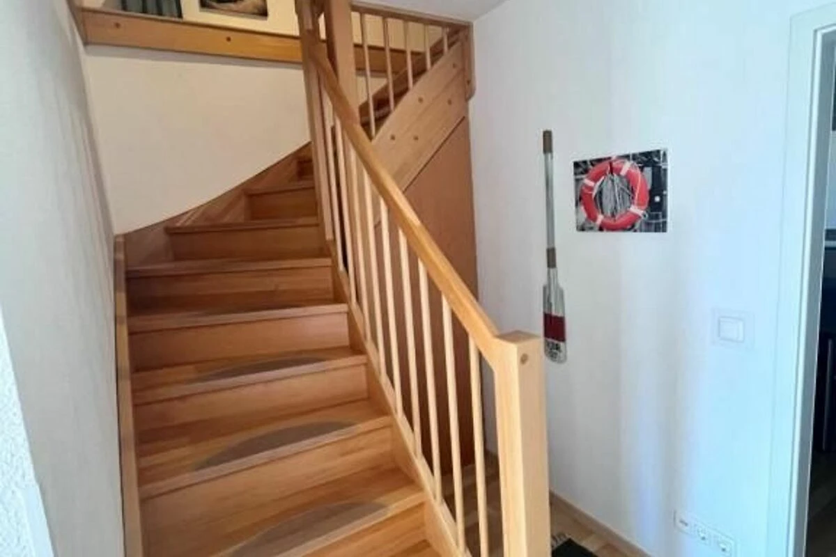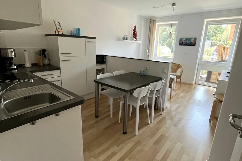 Die Ferienwohnung erstreckt sich über 2 Etagen, ist sehr geräumig und komfortabel eingerichtet. Im 1.OG befindet sich das Wohnzimmer mit einem schönen Balkon, ein Bad mit Dusche und WC. Die offene Einbauküche ist mit einem Ceranherd, Backofen, Kühlschrank, Tiefkühlfach, Gläser, Besteck und Geschirr ausgestattet. Die obere Etage mit zwei Schlafzimmern und einem zweiten Bad mit Dusche und WC, bietet einen weiteren Balkon, auf dem man gemütlich den Tag ausklingen lassen kann. In der kalten Jahreszeit sorgt eine Fussbodenheizung für behagliche Wärme. Die Ferienwohnung liegt ruhig am Ende der Strasse in der im Jahr 2011 erbauten Ferienwohnanlage Ostseepark Zempin.