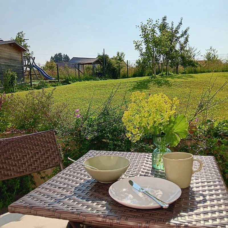 Sehr besonders ist die bezaubernde Ostterrasse mit kleinem Garten. Perfekt für ein schönes Frühstück am Morgen oder ein gemütliches Gläschen Wein am Abend.