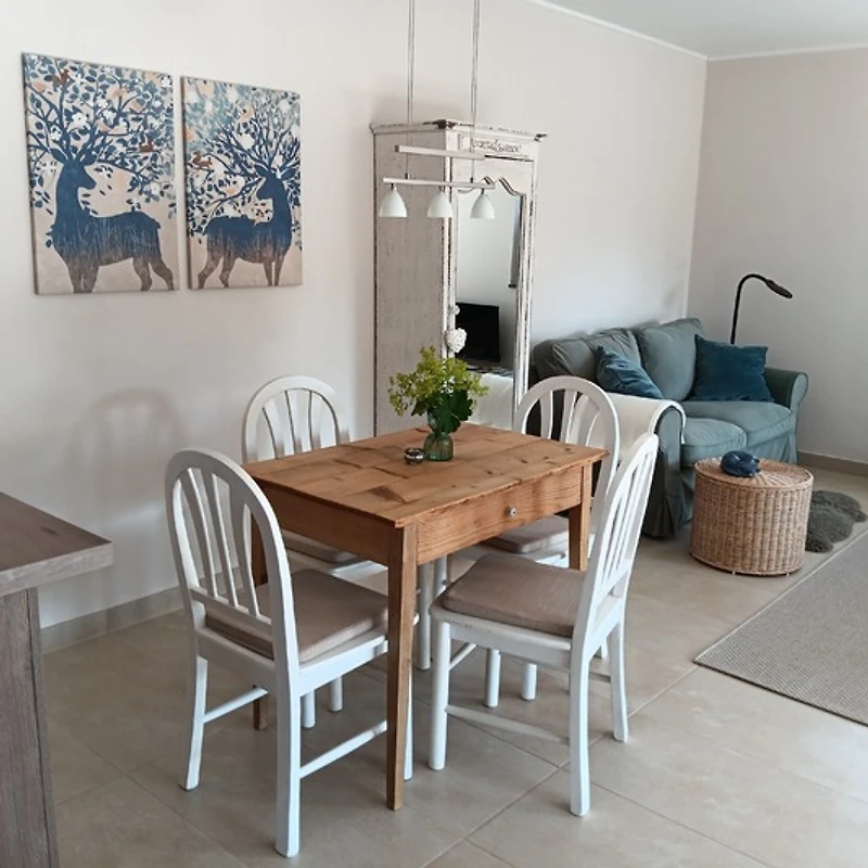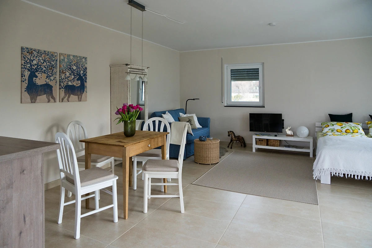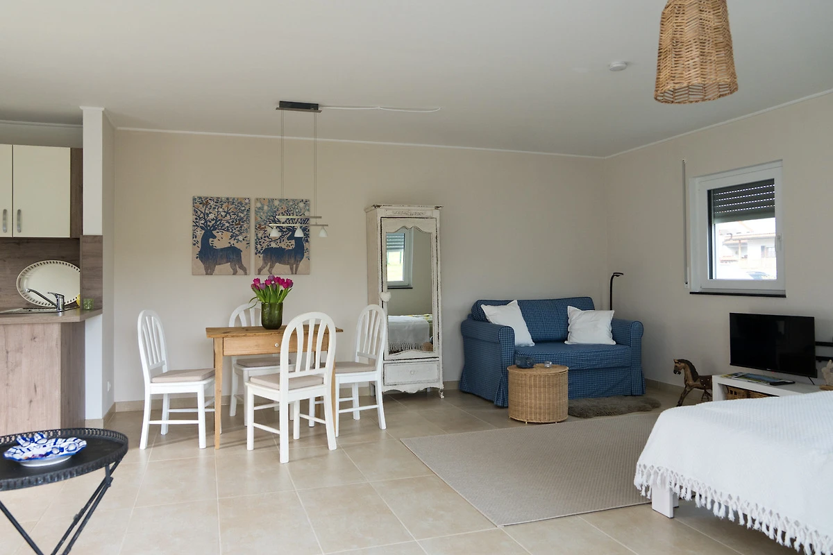 Der aparte Wohnraum lädt zum relaxen ein und man hat ausreichend Platz, um sich rundherum wohl zu fühlen, alles ist hell und freundlich. Auch ein kleiner Fernseher steht zum Entspannen bereit.