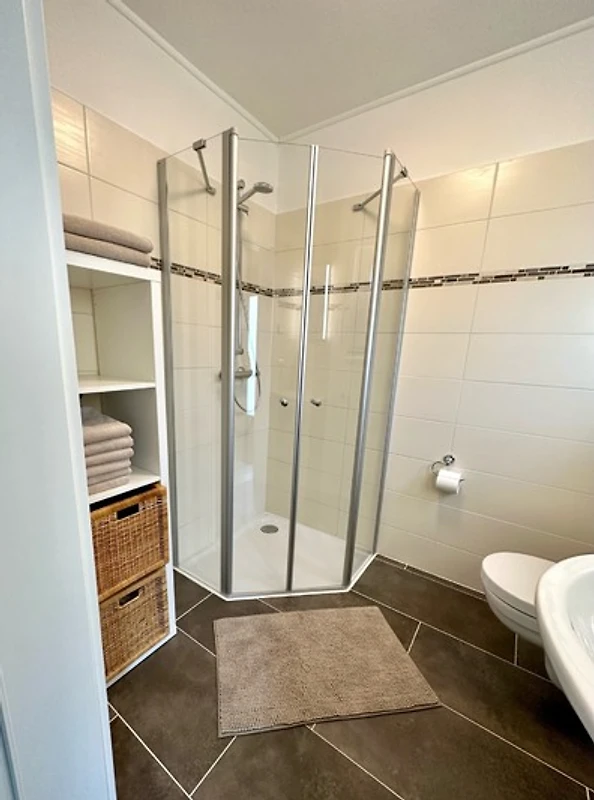 Das Badezimmer ist ganz neu und bietet mit Fenster und moderner Glasdusche einen hellen, kleinen Ort für entspannte Morgentoilette und erfrischende Duschmomente.