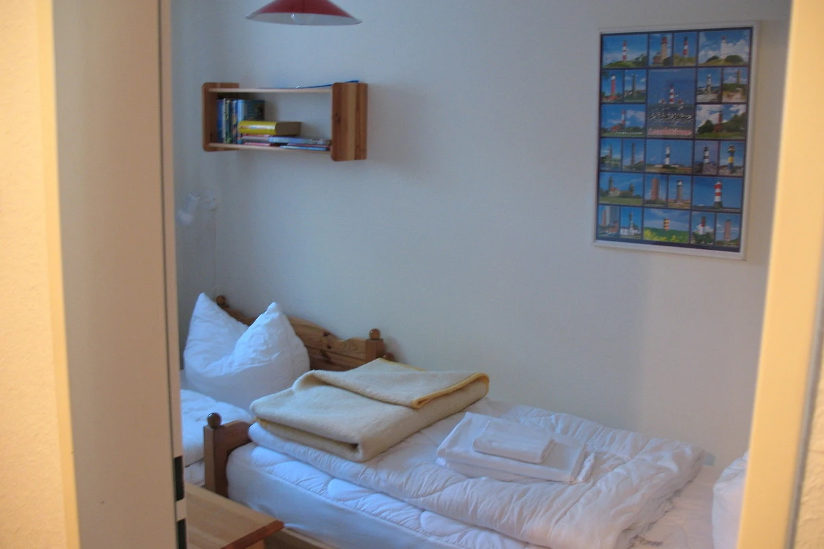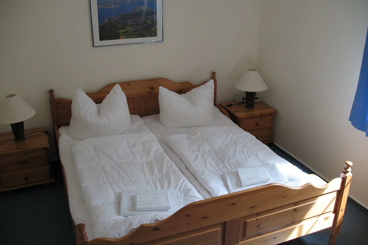 Im Untergeschoss befinden sich die beiden Schlafzimmer, die erholsame Nächte garantieren. Das erste Schlafzimmer ist mit einem komfortablen Doppelbett ausgestattet, das zweite mit zwei Einzelbetten. Beide Zimmer sind geschmackvoll und funktional eingerichtet, mit ausreichend Stauraum für Ihre Kleidung und persönlichen Gegenstände. Das Doppelbett bietet Platz für Paare, während die Einzelbetten auch für Freunde oder Kinder ideal sind. Zudem stehen Ihnen auf Anfrage ein Kinderbett und ein Hochstuhl zur Verfügung, sodass die Ferienwohnung auch für Familien mit kleinen Kindern bestens geeignet ist.