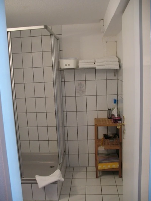 Das Badezimmer ist modern gestaltet und mit einer Dusche sowie einem Waschbecken ausgestattet. Im Untergeschoss befindet sich zusätzlich ein separates WC für noch mehr Komfort. Für Ihre Wäsche stehen eine Münzwaschmaschine und ein Münztrockner im Nebengebäude zur Verfügung.