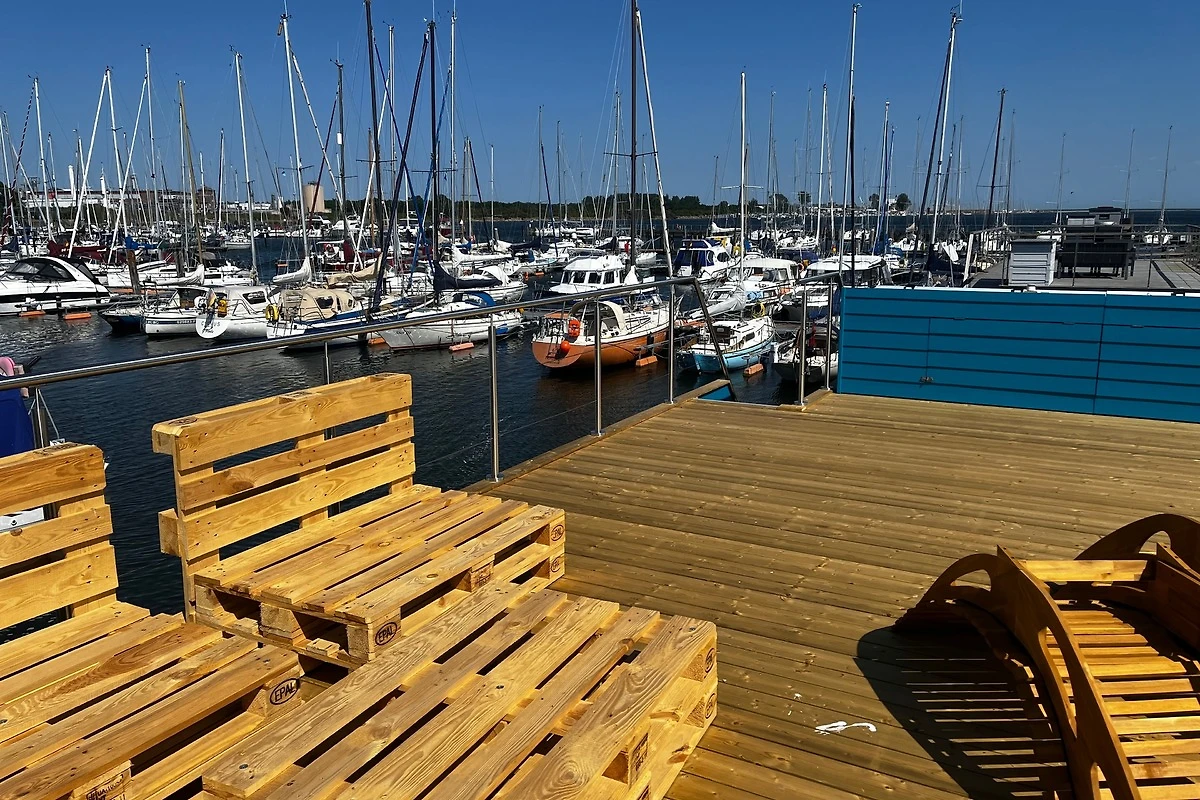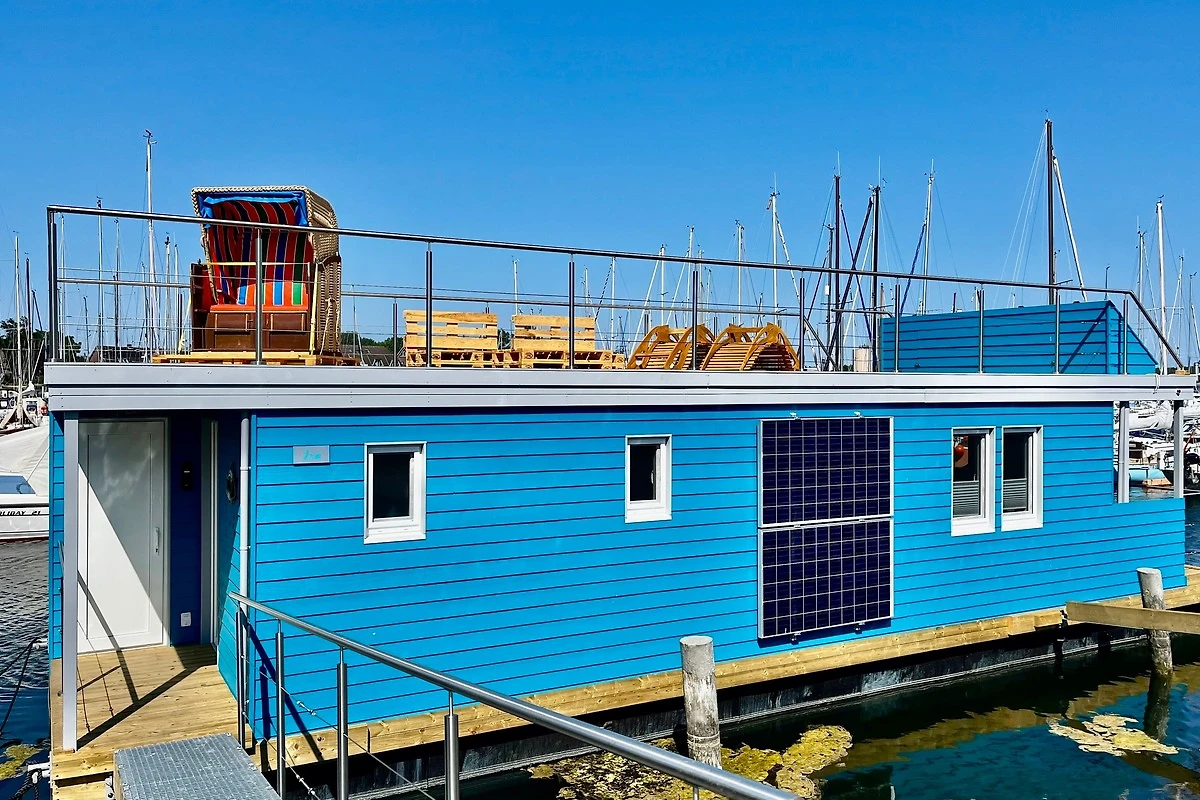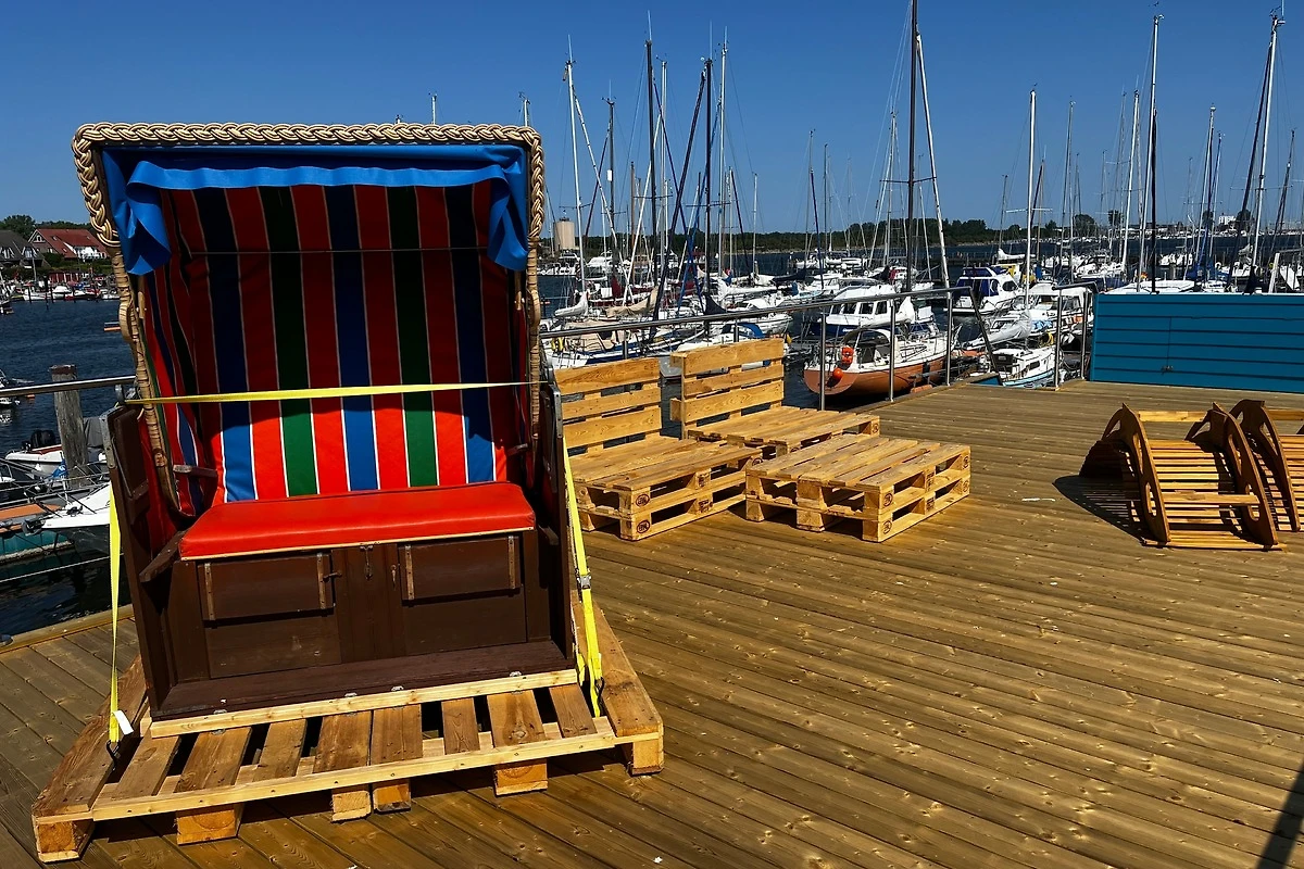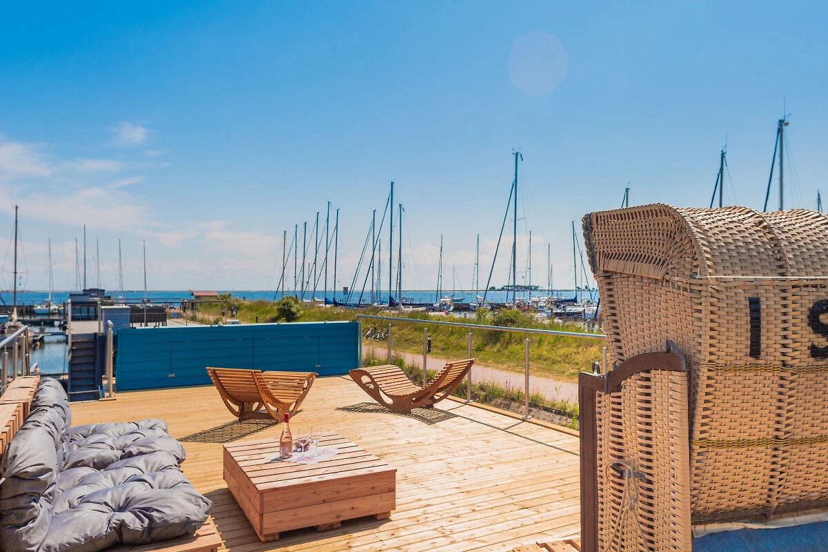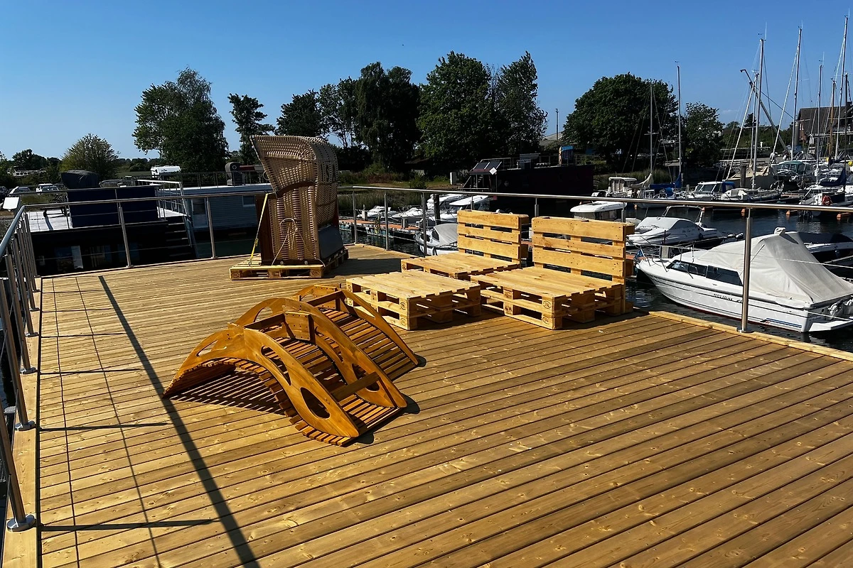 Das gesamte Oberdeck kann im vollen Umfang genutzt werden. Es steht ein eigener Strandkorb, gemütliche Palettenmöbel und Liegestühle zum Relaxen zur Verfügung. Hier haben Sie freien Blick auf das Meer und das Hafengeschehen.