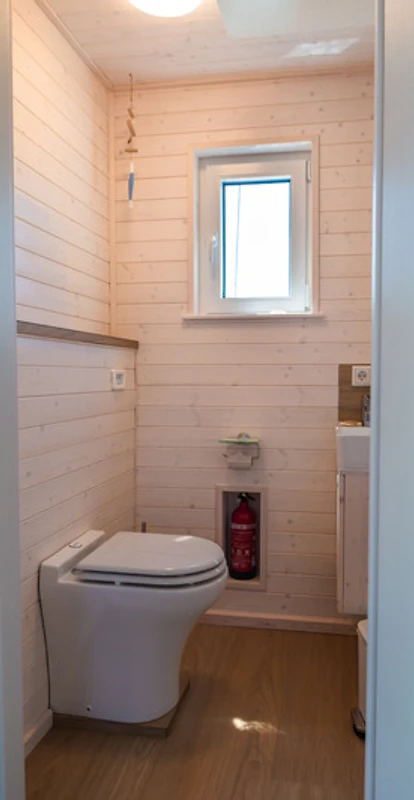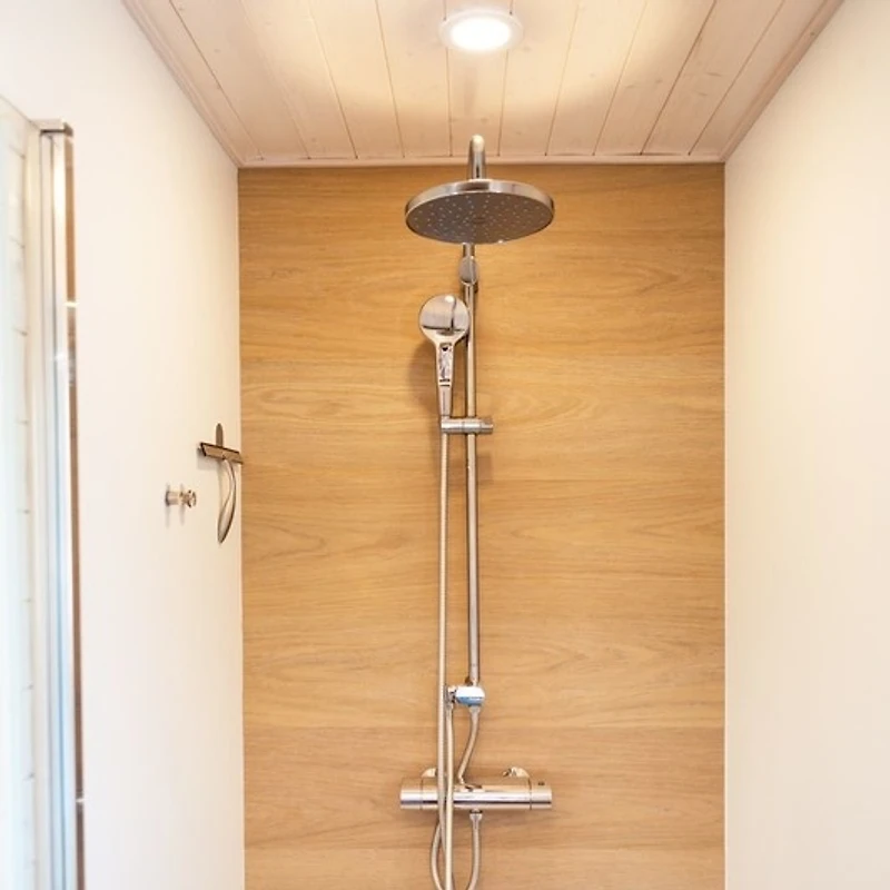 Das Dusch-Bad ist mit einer ebenerdigen Dusche sowie mit extra breiten Türen ausgestattet . Nur hier befindet sich die Fussbodenheizung. Das Hausboot verfügt über einen 60Liter Warmwasserboiler (warmes Wasser ist daher nur begrenzt nach Verbrauch verfügbar).
