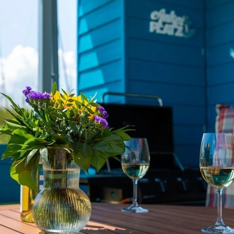 Auf der Terrasse, die über den Wohnbereich zu erreichen ist, geniessen Sie Ihren Kaffee/ Tee am Morgen, oder Sie veranstalten ein leckeres Barbecue am Abend direkt am Bord.