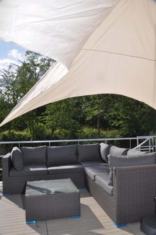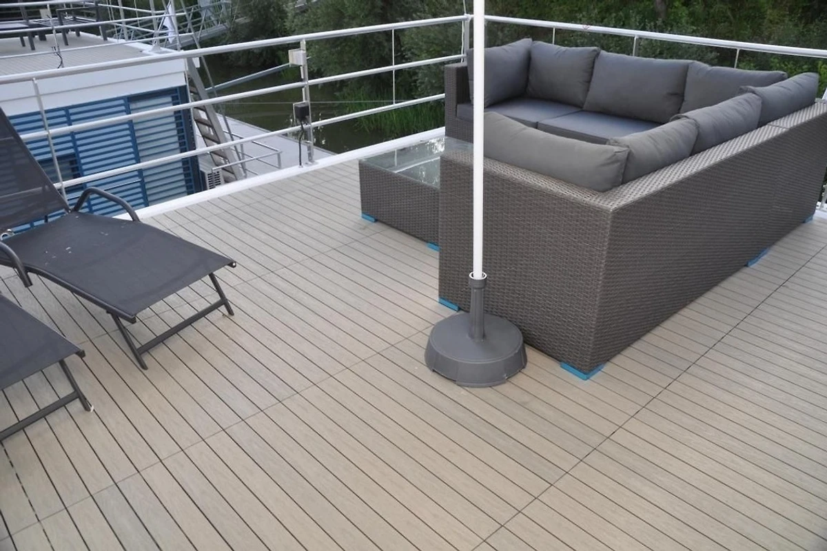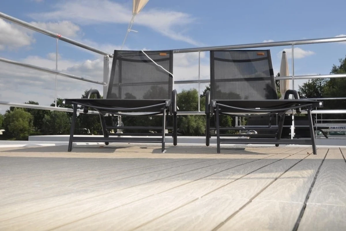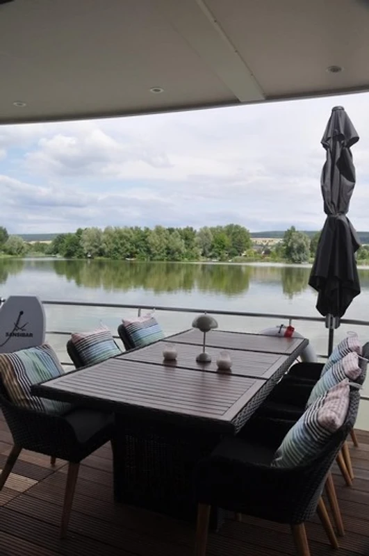 Aus dem Wohn- und Essbereich gelangen Sie auf die Terrasse. Hier können Sie Ihre Mahlzeiten geniessen. Erleben Sie das Gefühl von Freiheit auf dem Wasser!