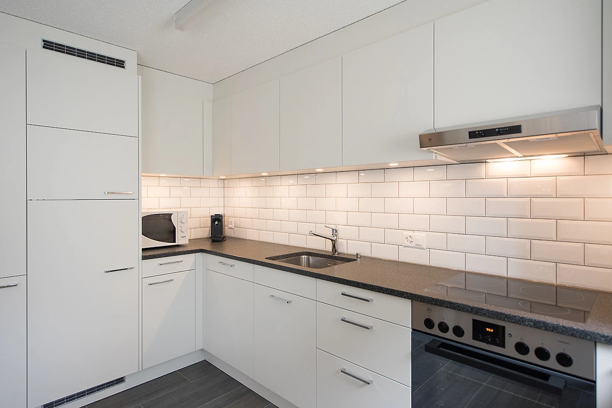 Offene Küche mit 4-Platten Glaskeramikherd, Backofen, Mikrowelle, Kühlschrank, Tiefgefrierer, Geschirrspüler, Kapsel-Kaffeemaschine.