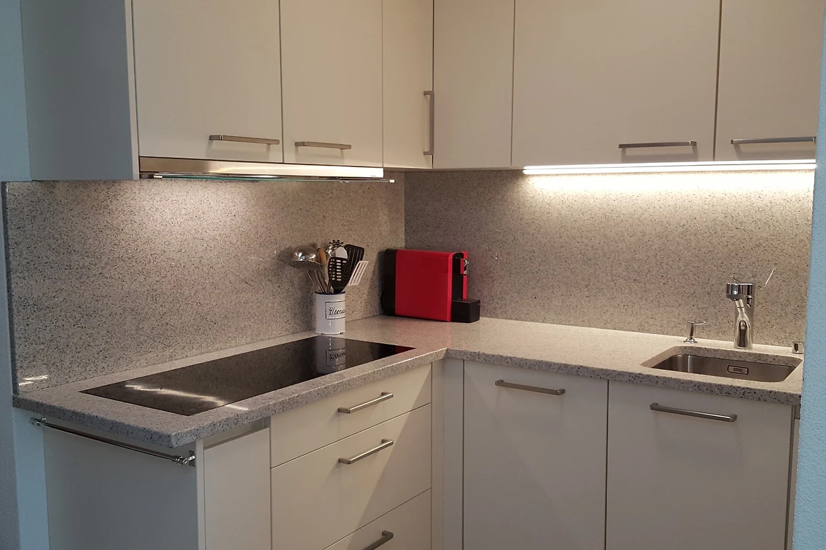 Offene Küche mit Dampfabzug, mit 4-Platten Glaskeramikherd, Kühlschrank mit Tiefgefrierfach, Backofen, Geschirrspüler, Mikrowelle, Kapsel Kaffeemaschine (Delizio).