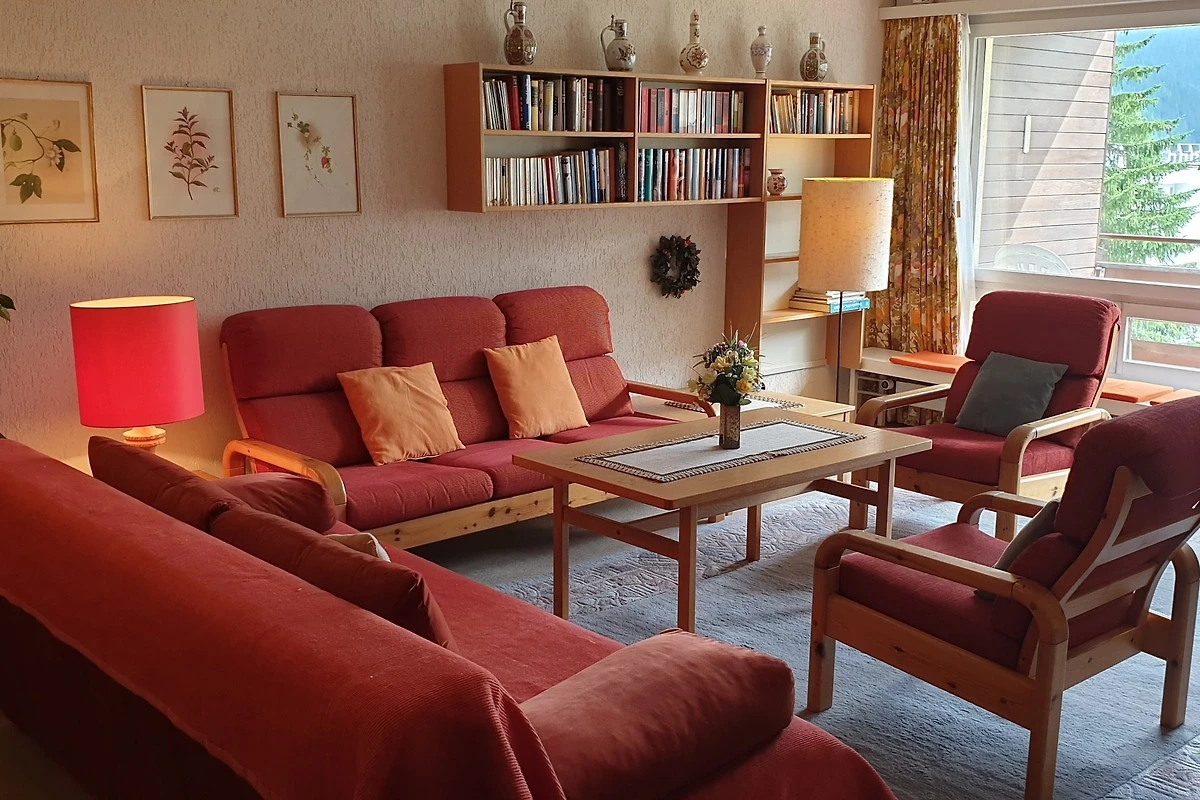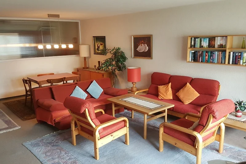 Wohnraum mit Polstergruppe, Sofabett (2 Personen), separate Essecke, Flachbild-TV, Wlan.