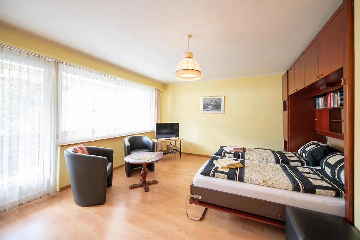 Wohnraum mit Polstergruppe, Essecke, 2 Klappbetten, 1 Bett, TV.