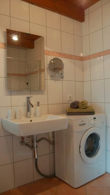 Badezimmer: Fliesenboden, Dusche, Waschtisch und WC, Waschmaschine