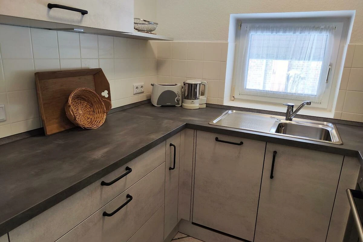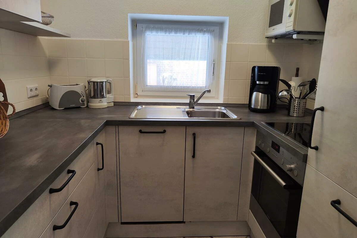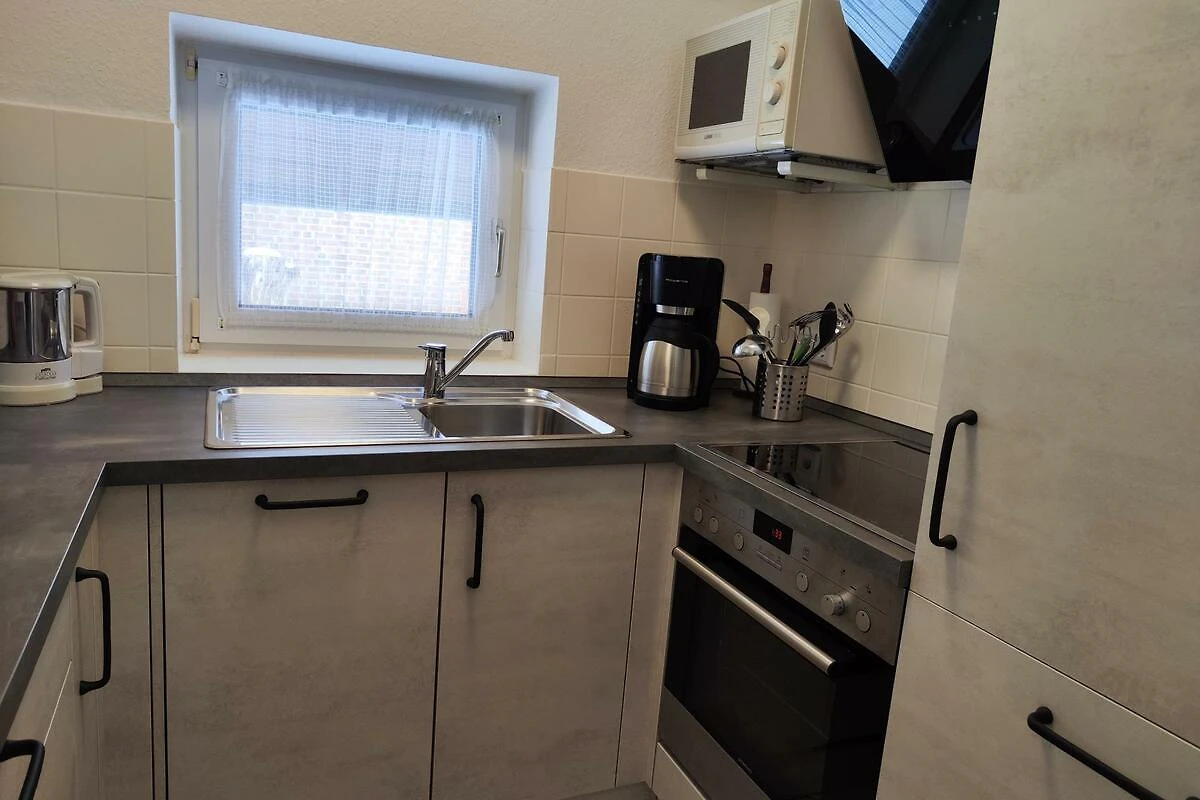 Küche: Fliesenboden, komplett ausgestattete Küche mit Geschirrspülmaschine, Backofen, Herd, Mikrowelle, Kühlgefrierschrank, Kaffeemaschine, Wasserkocher und Toaster