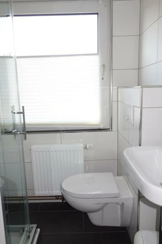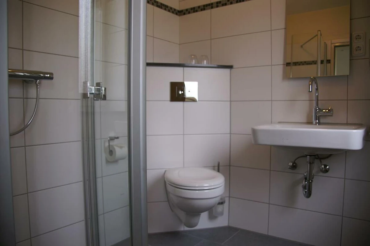 Badezimmer: Fliesenboden, Dusche, Waschtisch, WC und Waschmaschine. Zusätzlich steht Ihnen auf der oberen Etage ein zweites Bad mit Dusche, Waschbecken und WC zur Verfügung