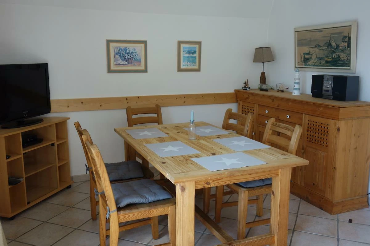 Auf der unteren Wohnebene befindet sich das gemütliche Wohnzimmer mit schöner Fensterfront und Zugang zu der teilüberdachten und geschützten Südterrasse. Der grosszügige Ess-/Sitzbereich lädt zu geselligen Mahlzeiten und Spielabenden mit der ganzen Familie ein. Neben dem Wohnzimmer haben Sie in diesem Ferienhaus noch einen weiteren kleinen Wohnraum mit einem Sofa. Die kleine aber feine Küche ist unter anderem mit einer Geschirrspülmaschine, einem Kühlgefrierschrank, einem Backofen und einem Kochfeld ausgestattet. Das Duschbad verfügt über eine Waschmaschine. Neben dem Badezimmer im unteren Wohnbereich, steht Ihnen auf der zweiten Etage ein weiteres Bad mit Dusche, Waschbecken und WC zur Verfügung.