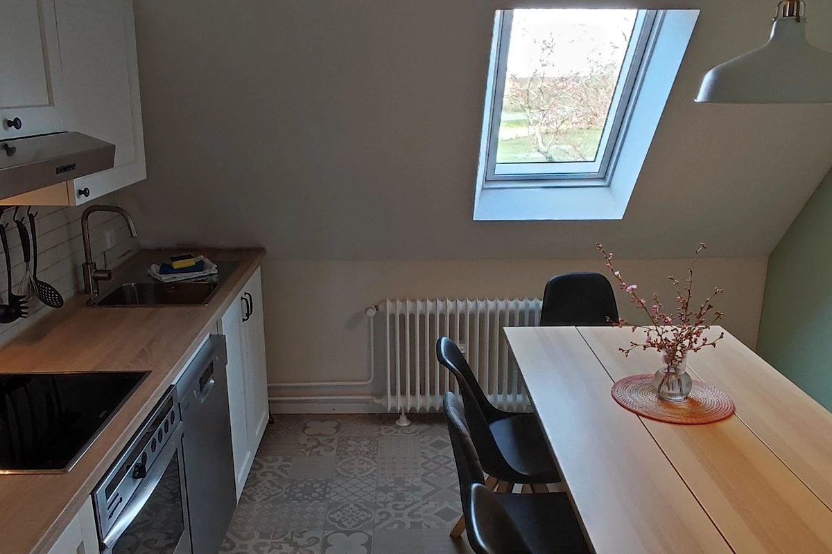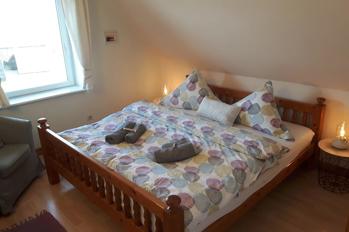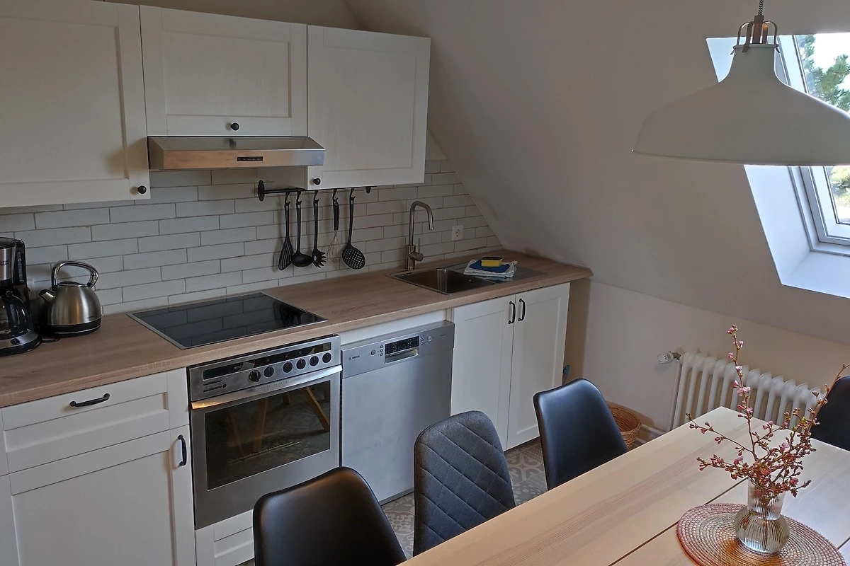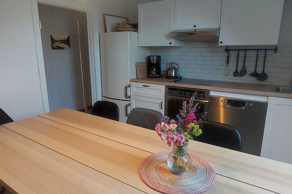 Die Wohnküche ist gut ausgestattet mit einem 4-Zonen Ceranfeld und Backofen, Dunstabzugshaube, Spülmaschine, Kühlschrank, separatem Gefrierfach, Kaffeemaschine, Wasserkocher und ausreichend Geschirr, dass Sie nach Herzenslust bekannte und auch neue nordfriesische Rezepte ausprobieren können.