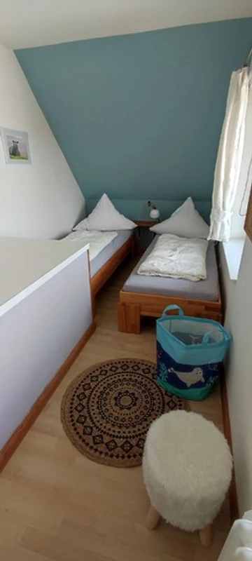 Hereinspaziert durch den eigenen Eingang führt ein Treppenaufgang über eine Dünenlandschaft in die Wohnung. Über den langen Flur erreicht man zwei Schlafzimmer, ein Wohnzimmer, das Bad mit separater Dusche, die gemütliche Wohnküche und das Zusatzzimmer auf der anderen Seite des Treppenaufgangs.