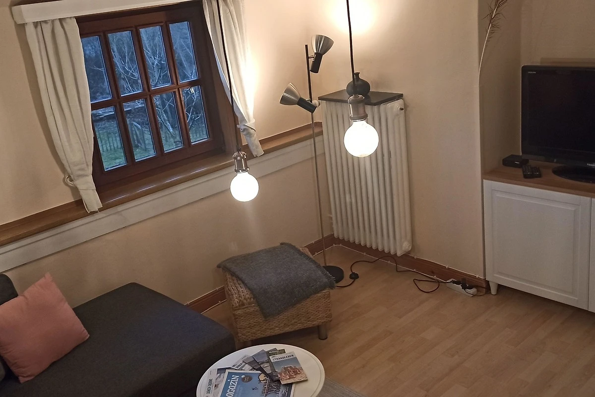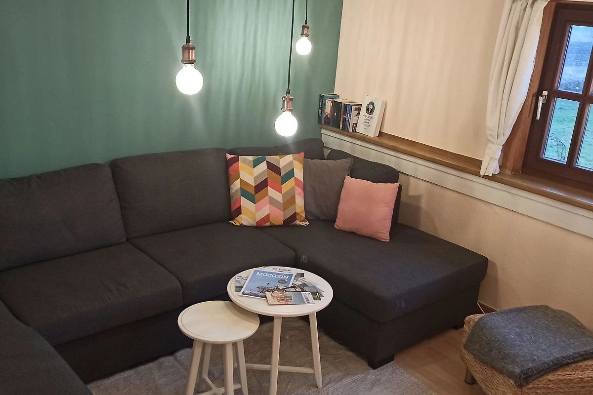 Im Wohnzimmer können Sie aus dem Fenster in den Garten und in die Weite schauen und sich auf dem Sofa ausruhen.