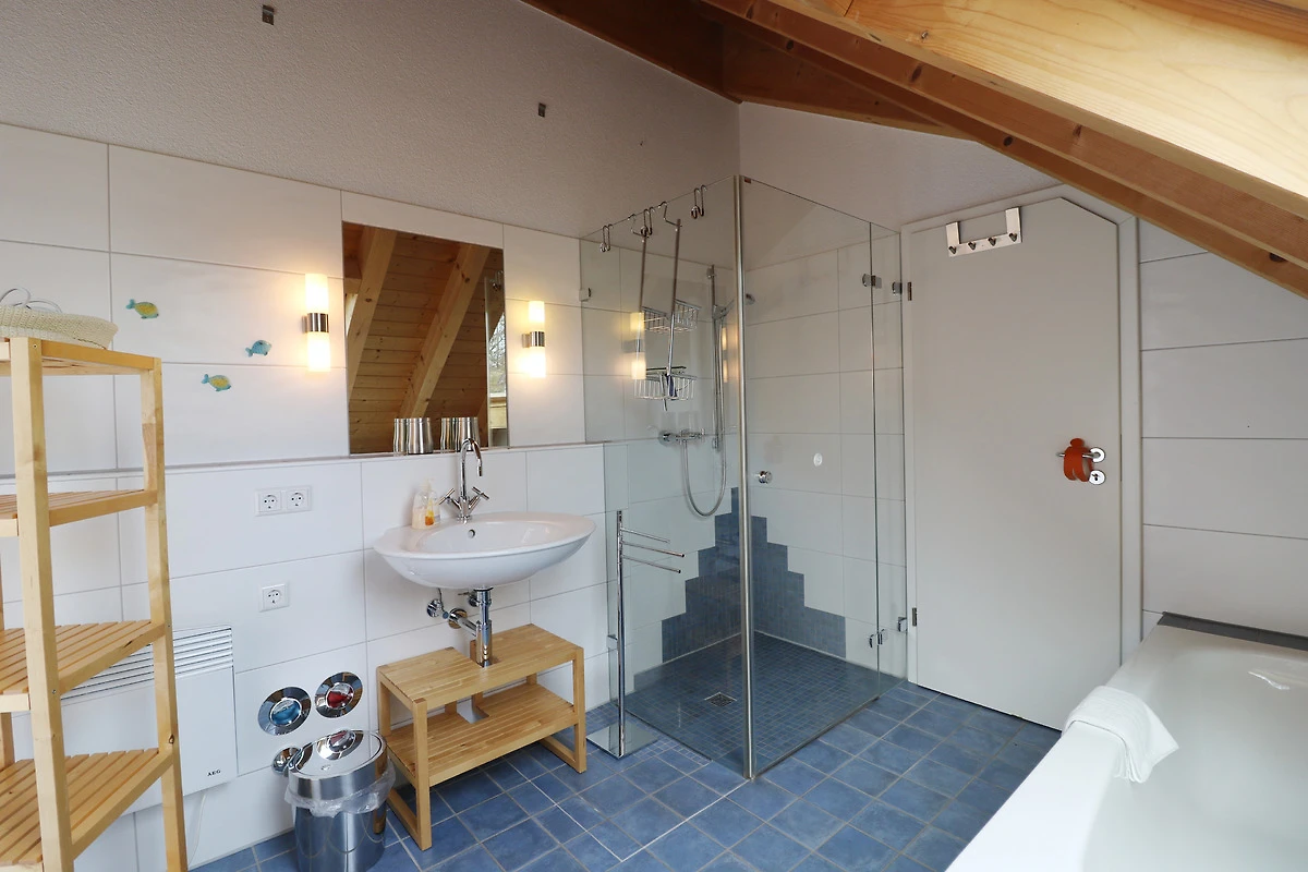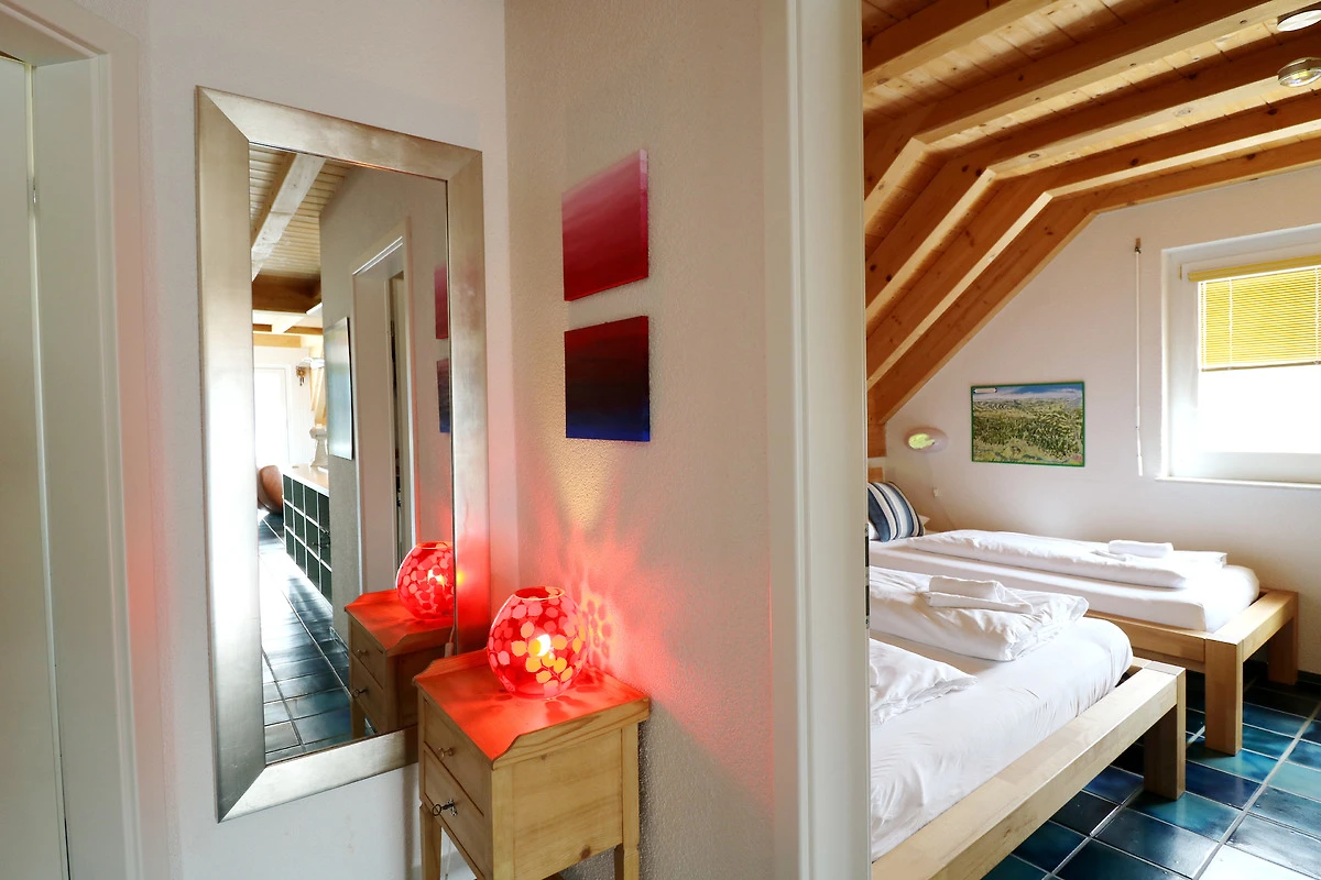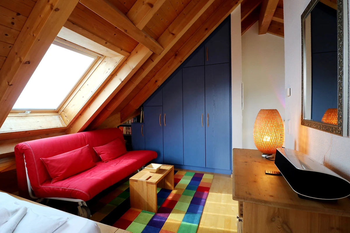 Über eine Treppe gelangen Sie zu einer offenen Galerie mit einem weiteren Schlafzimmer mit Doppelbett (200x200) und einem Schlafsofa (160x200). Ebenfalls befindet sich auf dieser Ebene ein grosses Badezimmer mit Badewanne und bodengleicher Dusche.