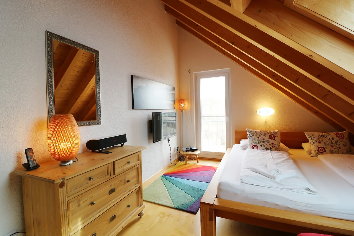 Ebenfalls befindet sich auf dieser Ebene ein abschliessbares Schlafzimmer mit Doppelbett (160x200) und Einzelbett (90x200), ein Bad mit bodengleicher Dusche und eine grosse Südterrasse mit freiem Blick auf den See.