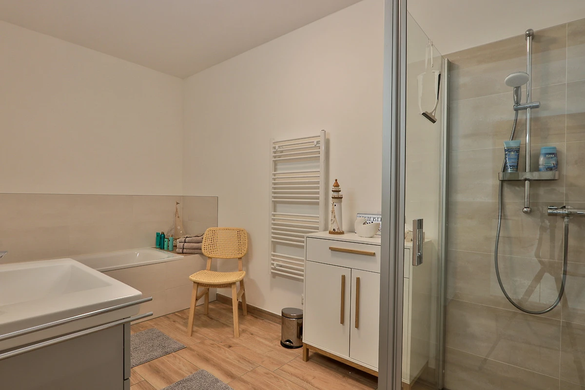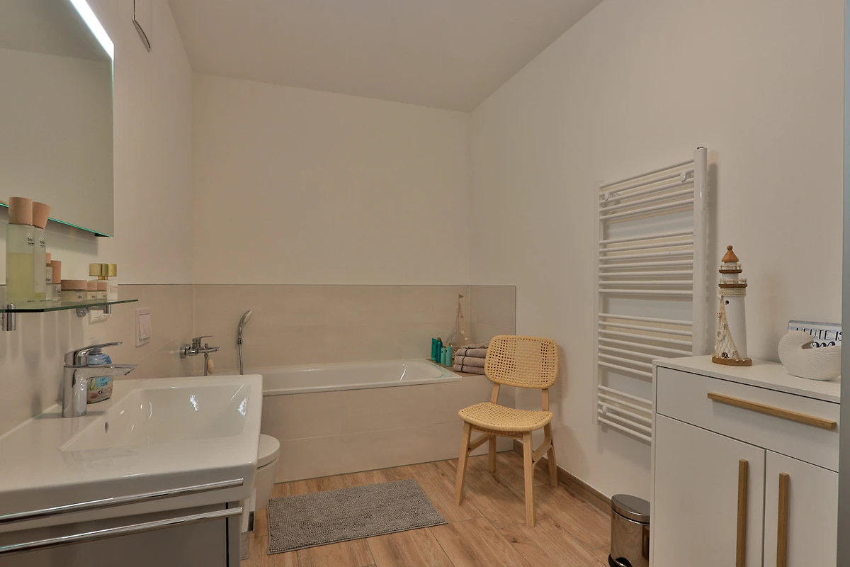 Das komfortable Bad hat eine Badewanne sowie eine grosse bodengleiche Dusche, eine Waschmaschine mit Münzautomat steht Ihnen ebenfalls zur Verfügung.
