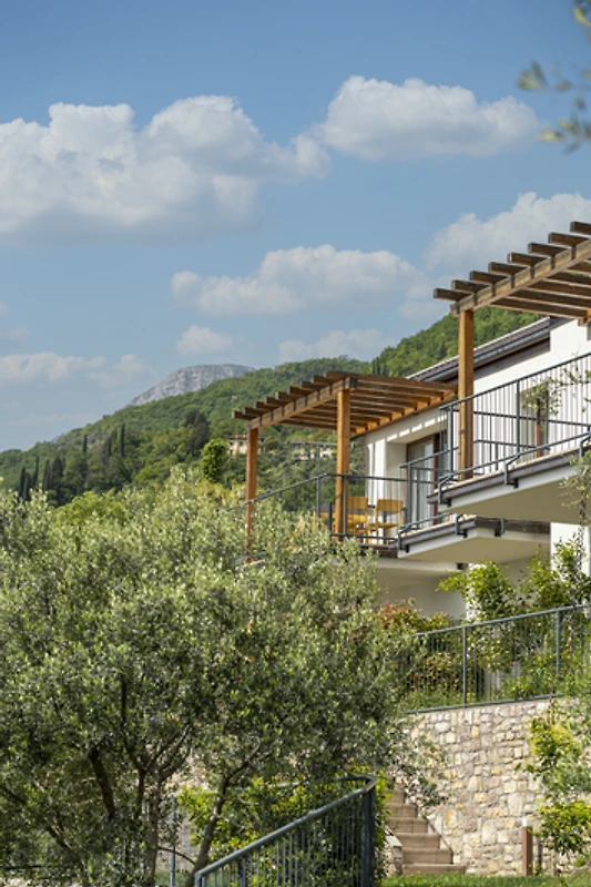 Entspannung & Freizeit: Balkon, Garten, Pool und Liegestühle mit traumhaftem Seeblick.