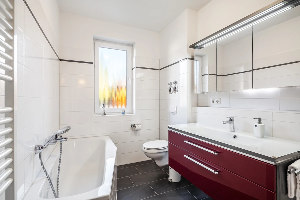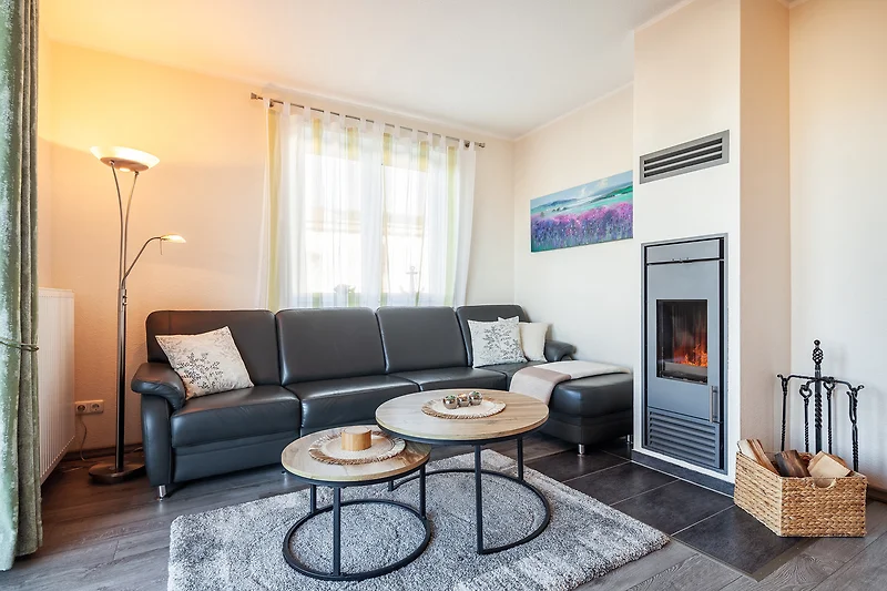 Die Fewo 'Bounty' , 71qm, mit einer grossen Terrasse liegt im Erdgeschoss und verfügt über 2 Schlafzimmer. Die offene Küche in weiss/Lack mit hellgrauer Arbeitsfläche, ist mit allem Komfort wie Geschirrspüler, Kühlschrank mit Gefrierfach, Mikrowelle, Cerankochfeld, erhöhter Backofen, Granitspüle, Kaffeemaschine usw. ausgestattet. Der Esstisch aus grauer Eiche mit den bequemen Schwingstühlen bietet Platz für 4 Personen. Der gemütliche Wohnraum mit Kamin ist mit einer dunkelgrauen Leder-Komfortsitzecke und einem behaglichen Fernsehsessel ausgestattet. Ein 50 Zoll-Smart TV, Blu-Ray-Player, sowie Spiele, Bücher und Umgebungskarten sind vorhanden. Das schöne Badezimmer mit Tageslichtfenster ist in schwarz/weiss gehalten, mit einem rotem grossen Waschtisch mit Glaswaschbecken, 1m x 1m Dusche und Badewanne, Fussbodenheizung und Radio ausgestattet. Der geräumige Flur und ein separater Abstellraum bieten viel Platz. Ein Schlafzimmer hat ein Doppelbett (180 x 200 cm) und einen weiteren 41 Zoll-Smart TV. Im anderen Schlafzimmer befinden sich 2 Einzelbetten mit einer Liegefläche von 90 x 200 cm. An allen Türen und Fenstern befinden sich elektrische Rolläden.