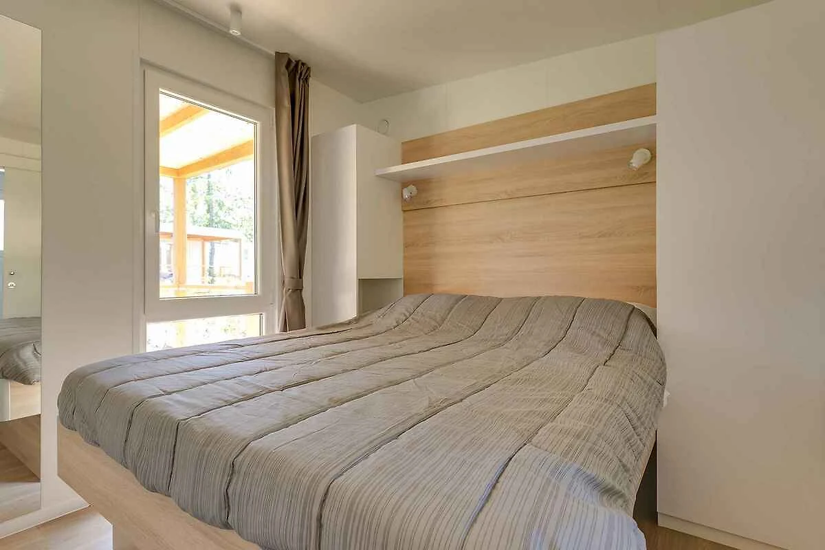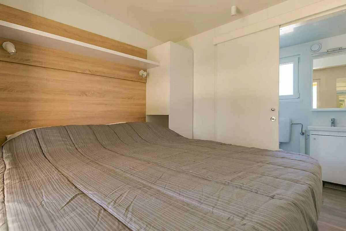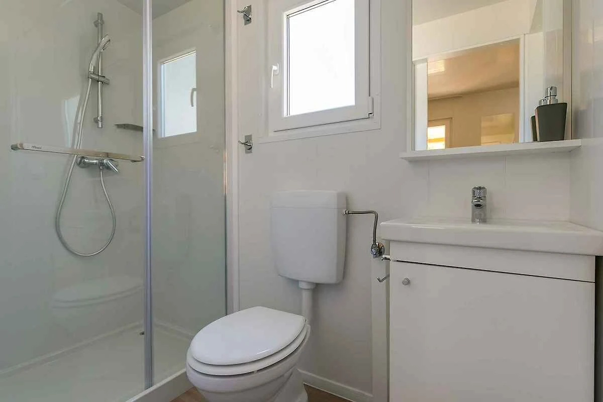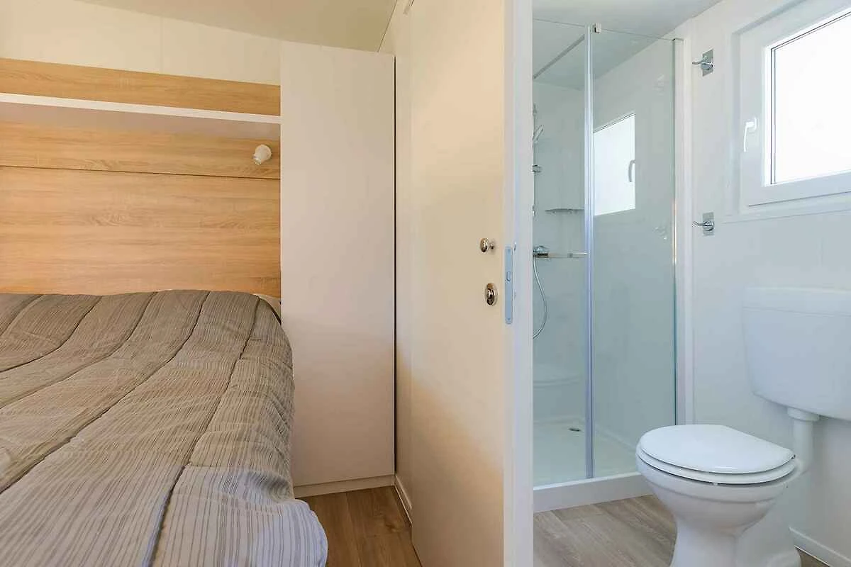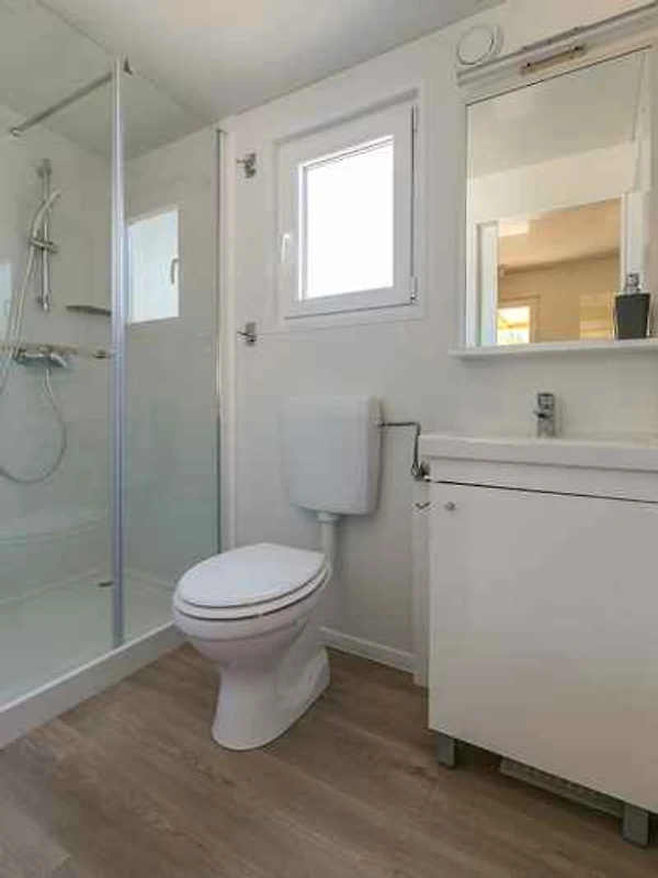 Der Eingang in Ihr Mobilehome führt über eine Aussentreppe. Wohnküche mit 2 Zusatzbetten auf Doppelausziehcouch, TV, Klimaanlage und Essecke. Schlafzimmer mit 1 Doppelbett. Schlafzimmer mit 2 Einzelbetten. Küche mit Gasherd (4 Flammen), Dunstabzugshaube, Kühlschrank, Mikrowelle, elektrischem Wasserkocher und Zugang zur Terrasse. Bad mit Dusche, 1 Waschbecken und WC. Separates WC mit 1 Waschbecken und WC.