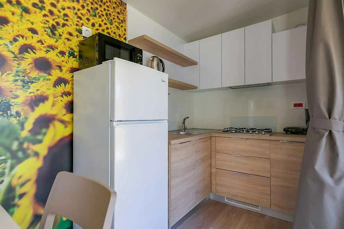 Karigador. Das Mobilehome befindet sich auf einem Campingplatz, auf einem geschlossenen Gartengrundstück mit Wiese, Blumen, Sträuchern und Bäumen. Die Zufahrt erfolgt über eine Nebenstrasse (Geröll oder Schotter). Parkplatz (für 1 Pkw) auf dem Grundstück.
