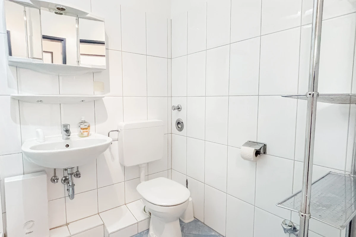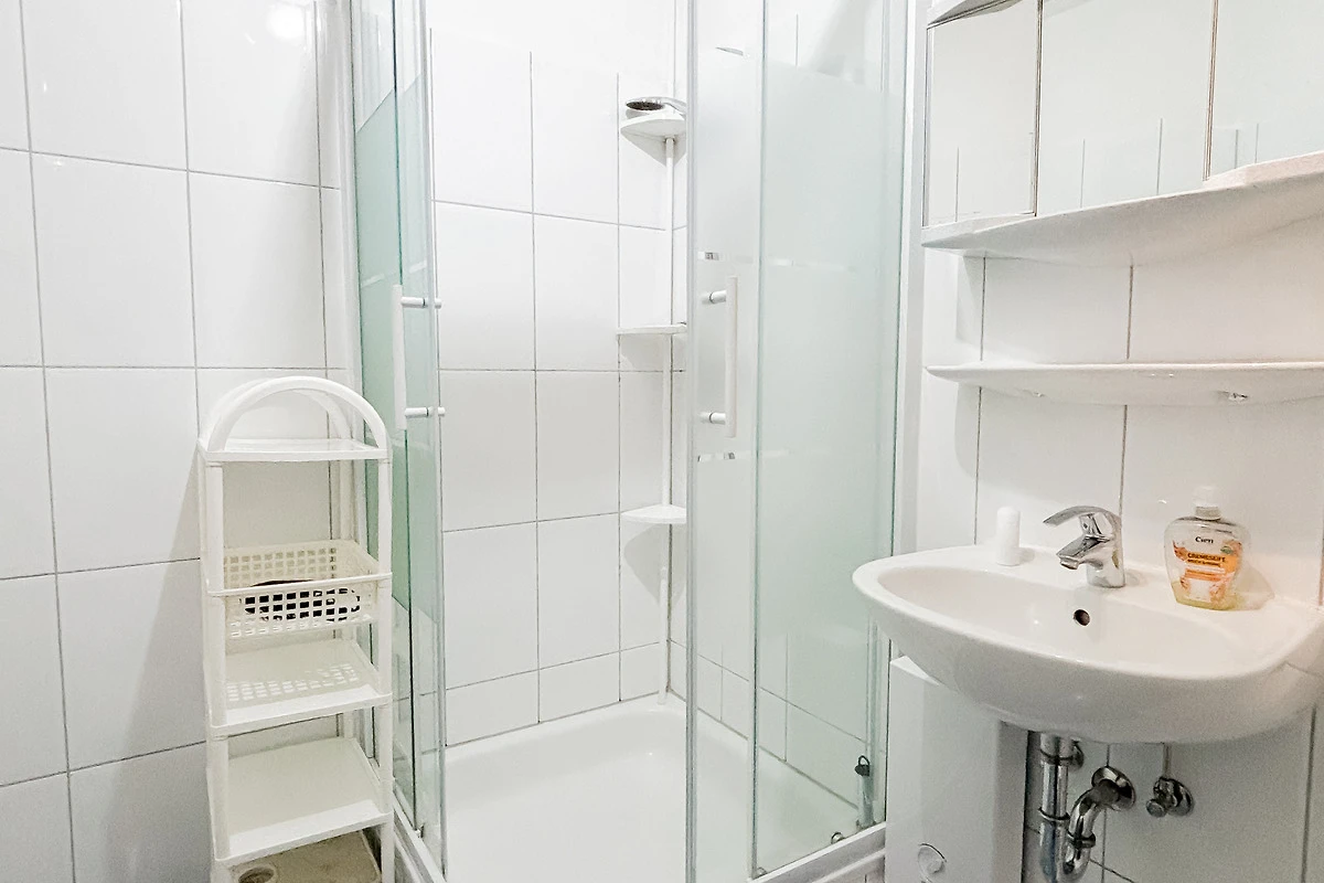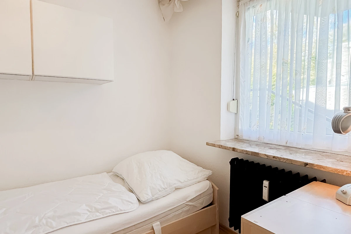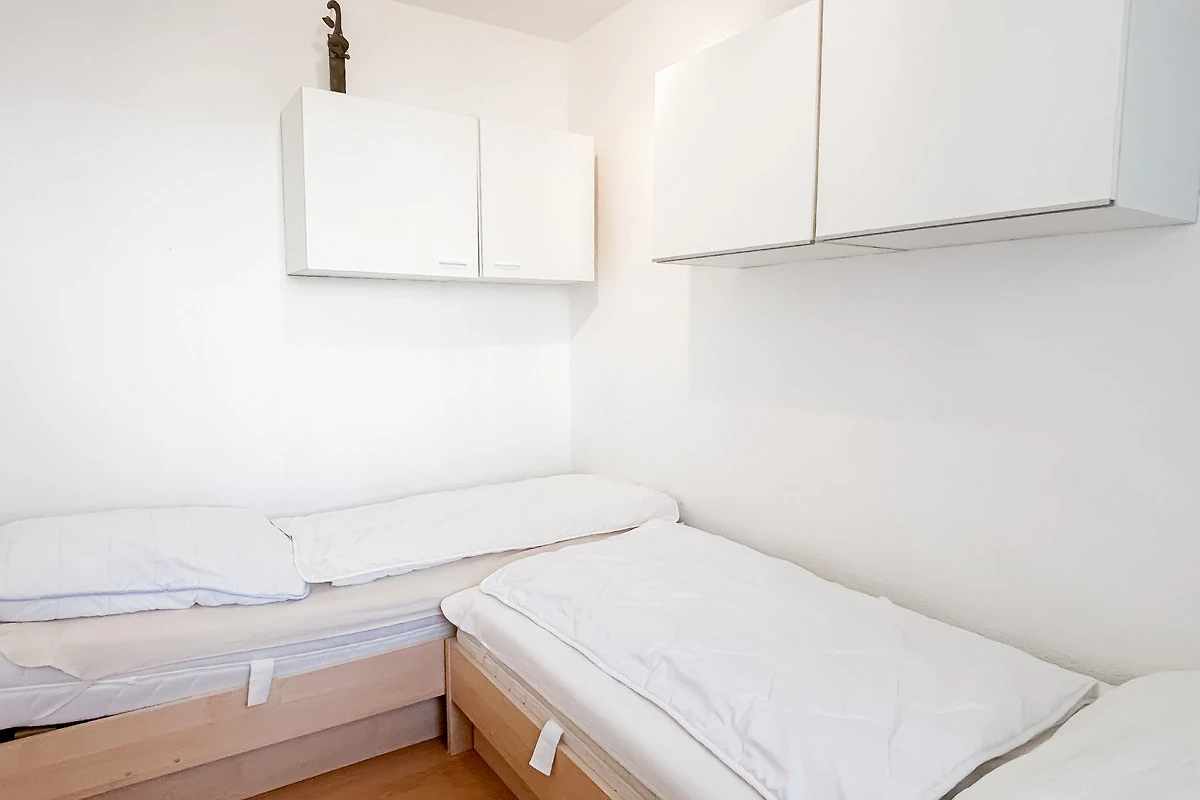 Im 2. Zimmer stehen 2 Einzelbetten . Das Duschbad ist hell und freundlich.