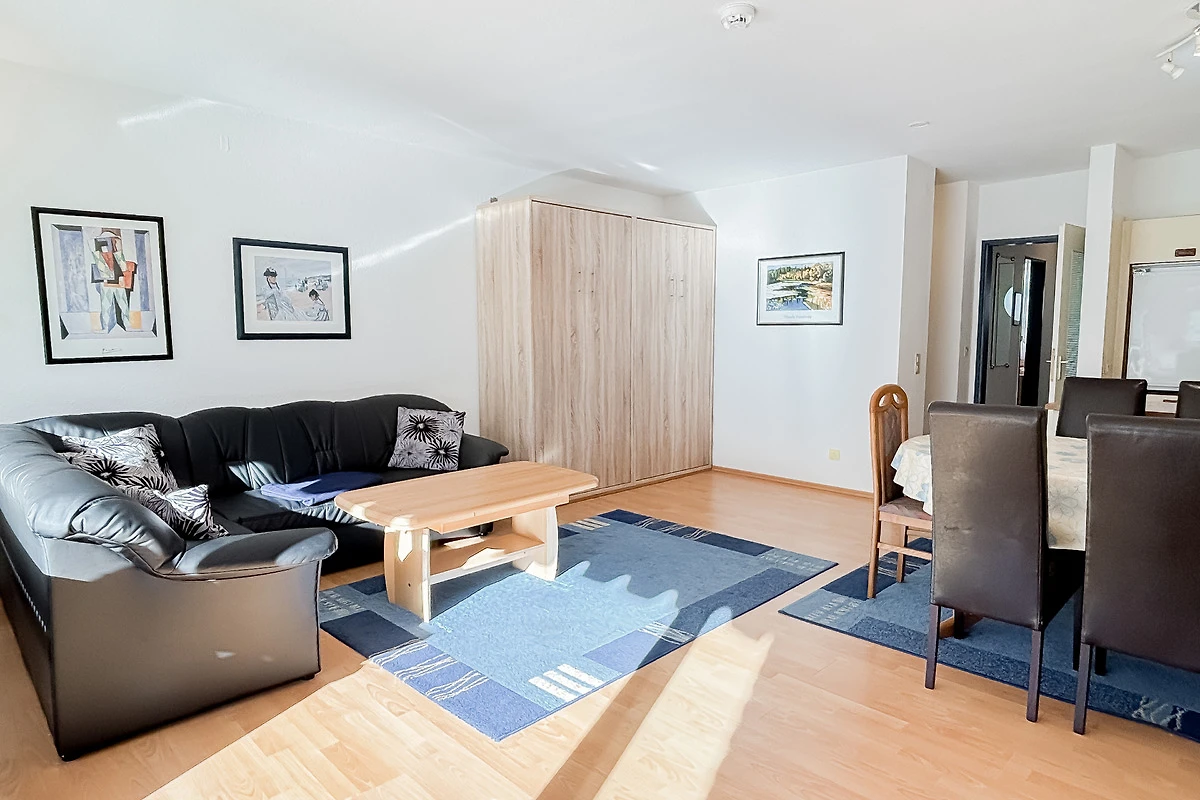 Diese Wohnung bietet einen modernen Wohnbereich mit Couchgarnitur, Sideboard, Radio, TV und 2 Schrankbetten.