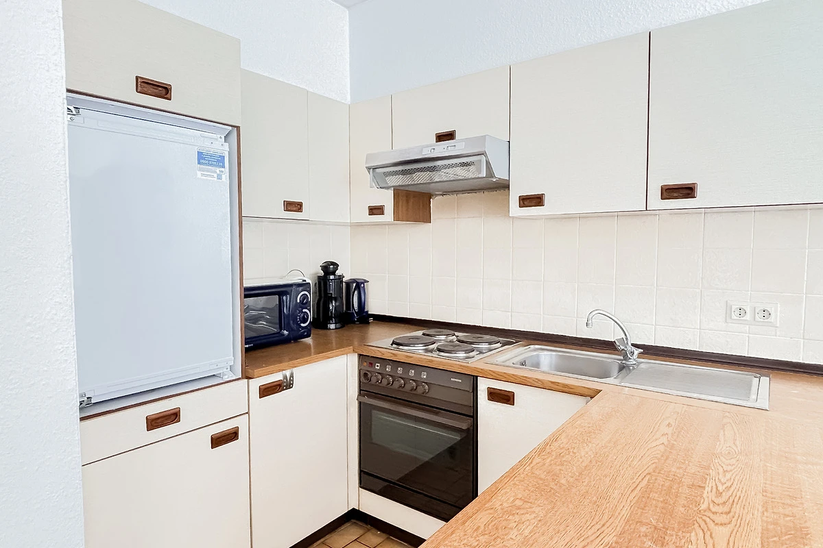 Die im Wohnzimmer integrierte offene Küche ist mit Cerankochfeld, Backofen, Geschirrspüler, Kühlschrank mit Gefrierfach und allen üblichen Geräten sehr gut ausgestattet. Ein Essplatz ist ebenfalls vorhanden.