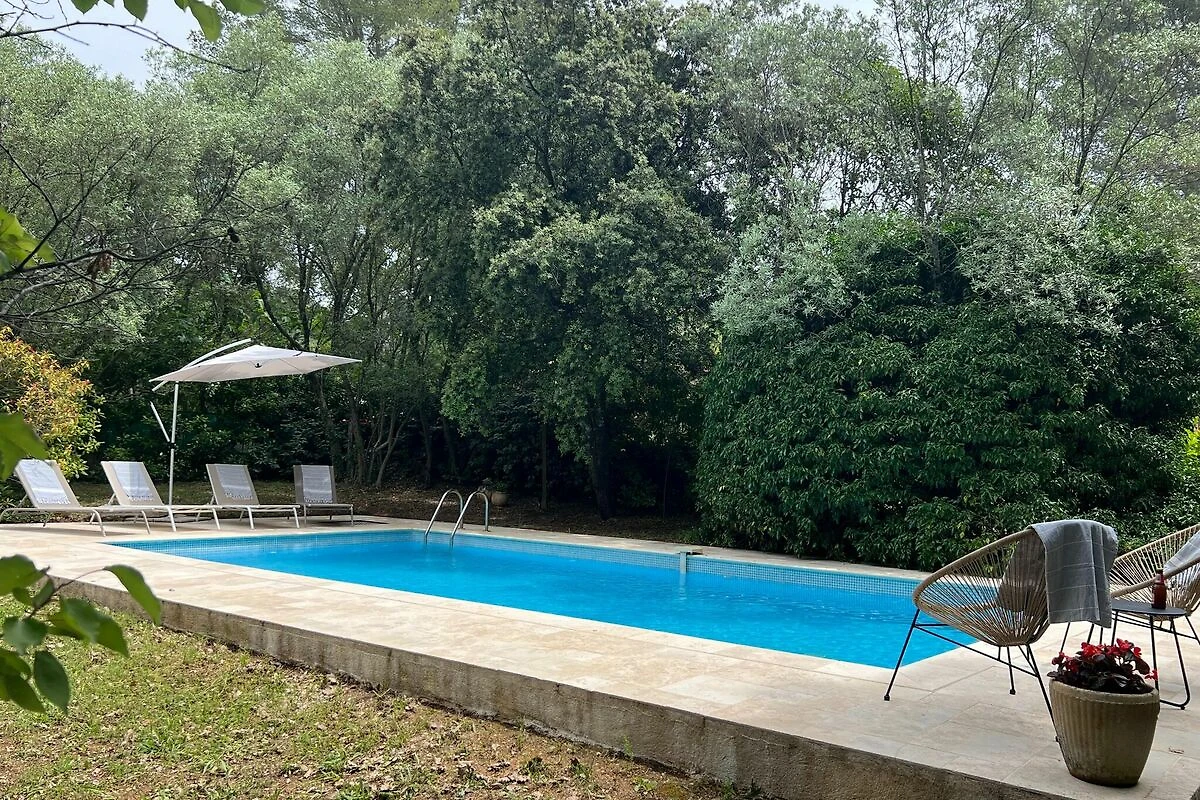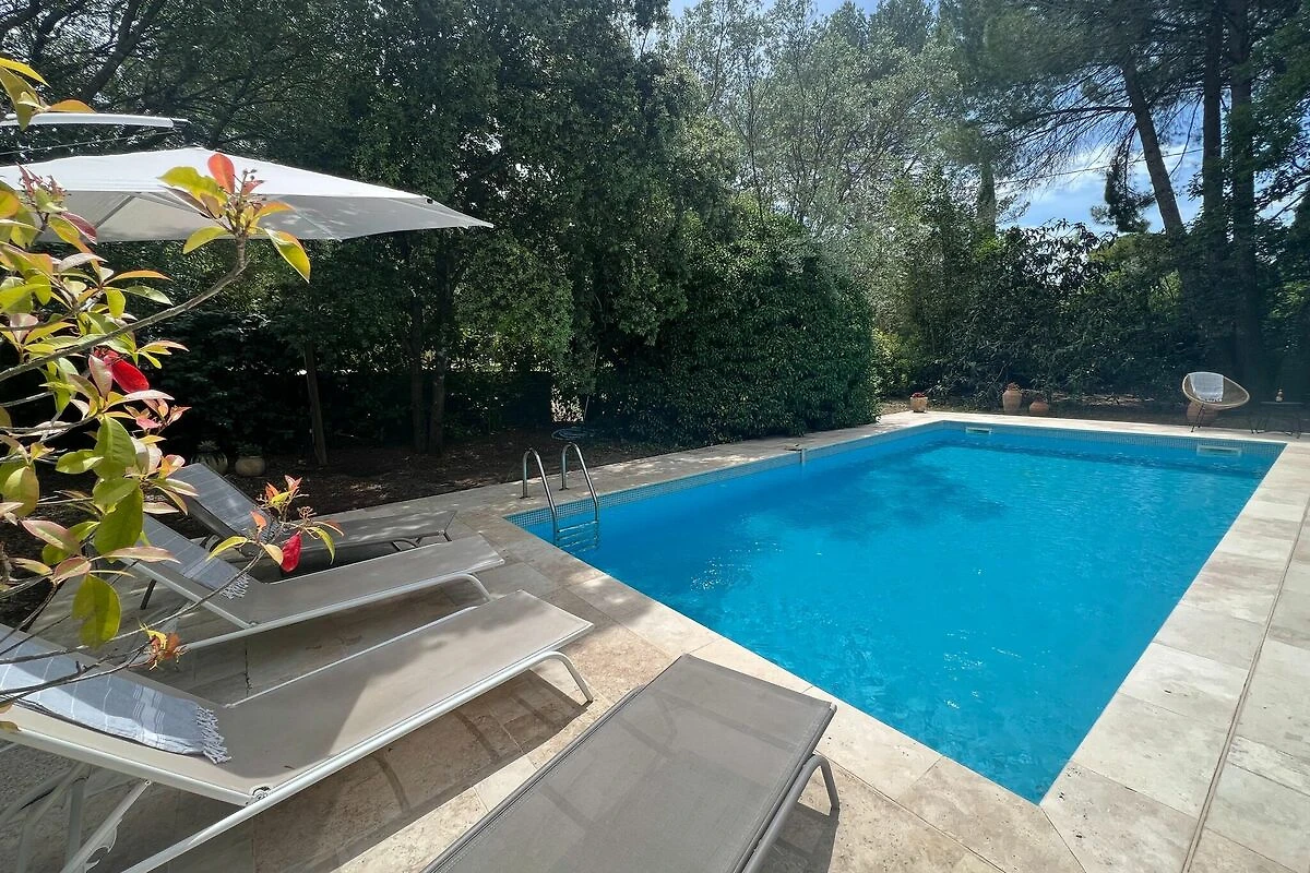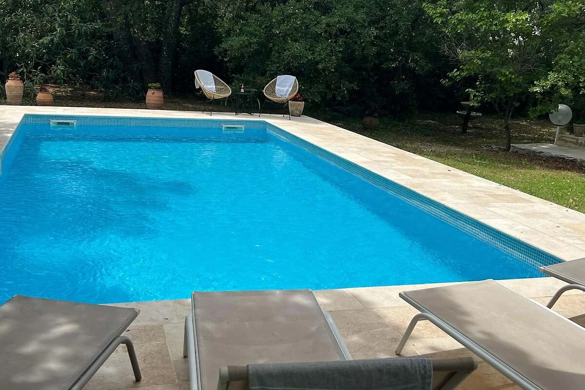Im Außenbereich laden mehrere Terrassen mit Gartenmöbeln zum Entspannen und Genießen der ruhigen Umgebung ein. Das Highlight ist der große Pool, umgeben von Liegestühlen, die zum Entspannen und Sonnenbaden einladen. Egal, ob Sie am Pool entspannen, auf der Terrasse speisen oder den üppigen Garten genießen, dieses Haus ist so konzipiert, dass es Ihnen einen komfortablen und ruhigen Aufenthalt im Herzen der Provence bietet.