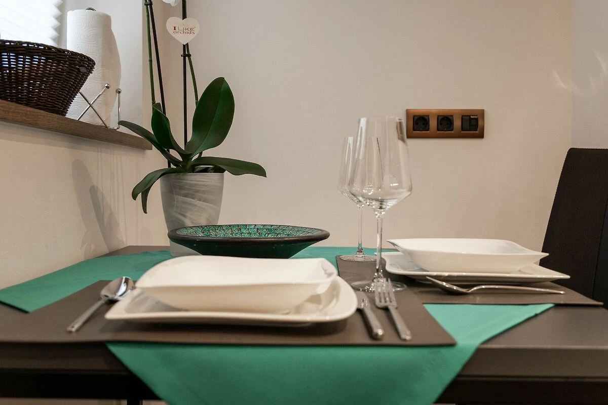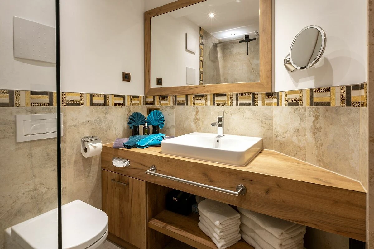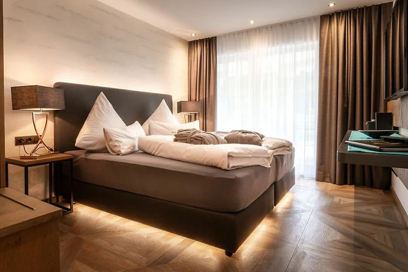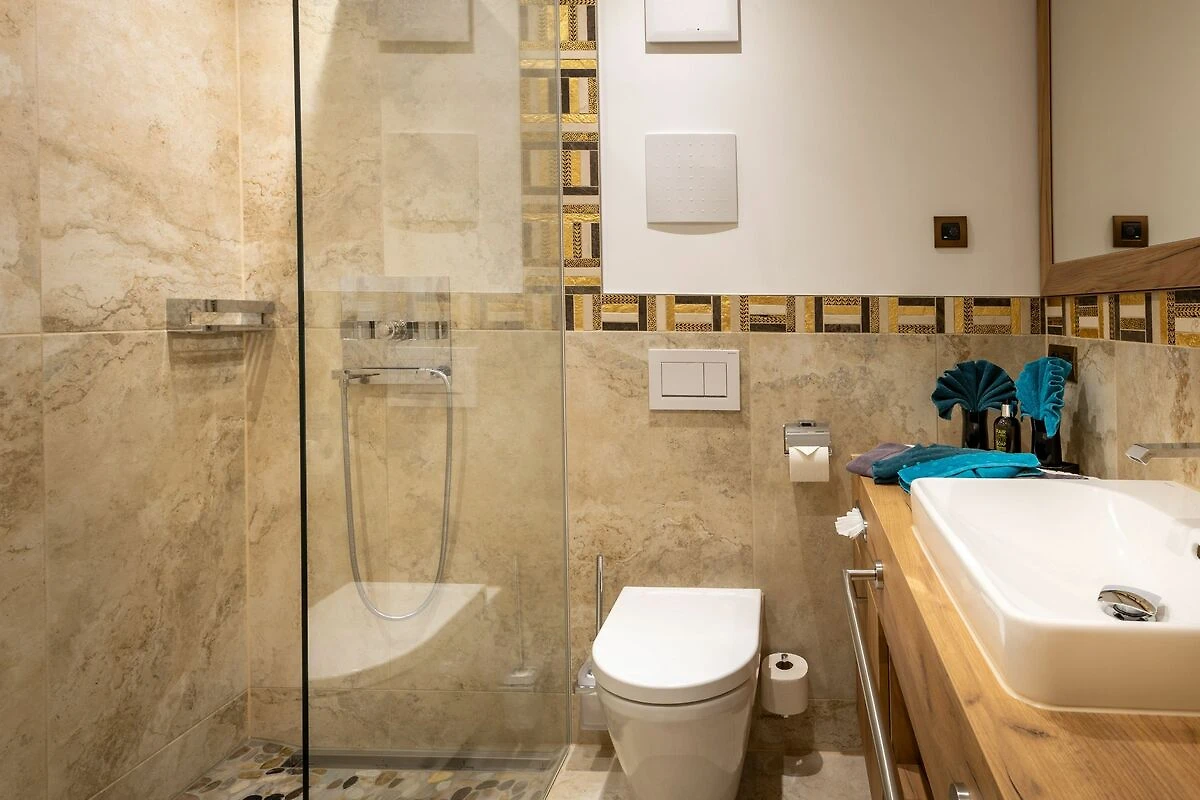 Mit effizient gestalteten Schlafzimmern mit zum Teil bodentiefen Fenstern und Boxspringbetten, modern gestalteten Bädern mit Regendusche, offen gehaltenem Flur, Wohn- und Essbereichen lässt es sich wunderbar entspannen und dem Alltag entfliehen. Unser dezentrales Lüftungssystem realisiert den geforderten Luftwechsel und sorgt für einen behaglichen und gesunden Luftumtausch in allen Appartements. Alle Appartements sind mit WLAN und TV-Flatscreen in allen Wohn- und Schlafzimmern ausgestattet und über einen Personenaufzug von der Tiefgarage bis zum Dachgeschoss erreichbar.