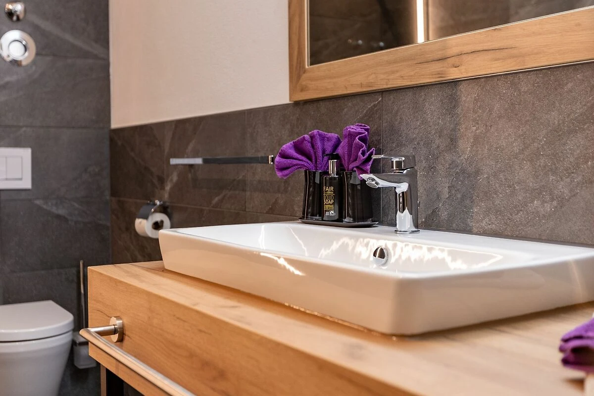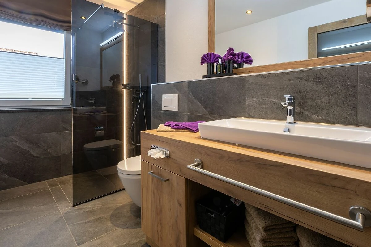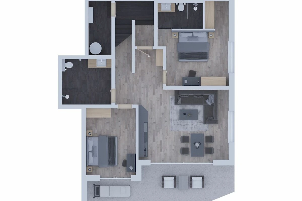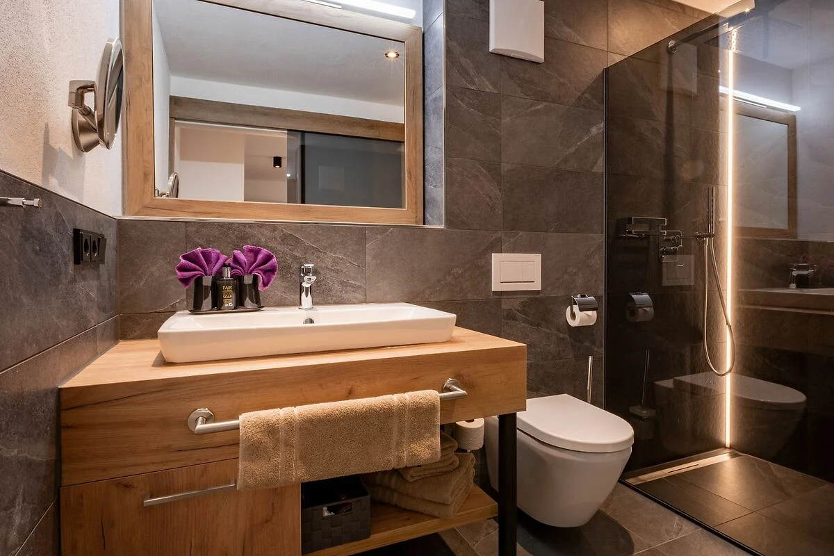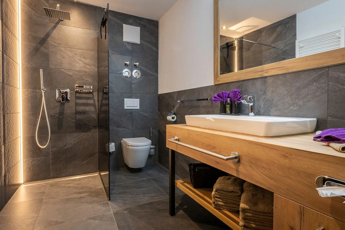 Die 3 Schlafzimmer sind mit komfortablen Boxspring-Doppelbetten ausgestattet, die für erholsame Nächte sorgen. Jedes der 3 Badezimmer verfügt über eine moderne Regendusche, ein WC, einen Föhn sowie Handtücher und einen Kosmetikspiegel für Ihr Wohlbefinden.