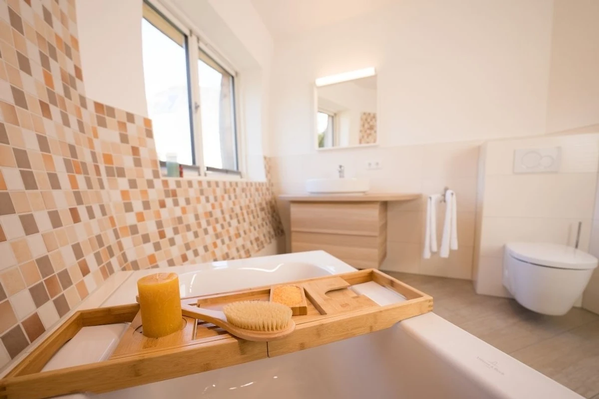 Es bietet 4 (-6) Personen Platz und verfügt über 2 schön ausgestattete Schlafzimmer, 2 Badezimmer sowie ab Herbst 2022 auch über eine Sauna im Erdgeschoss. Das untere Bad bietet Ihnen eine grosse Badewanne.