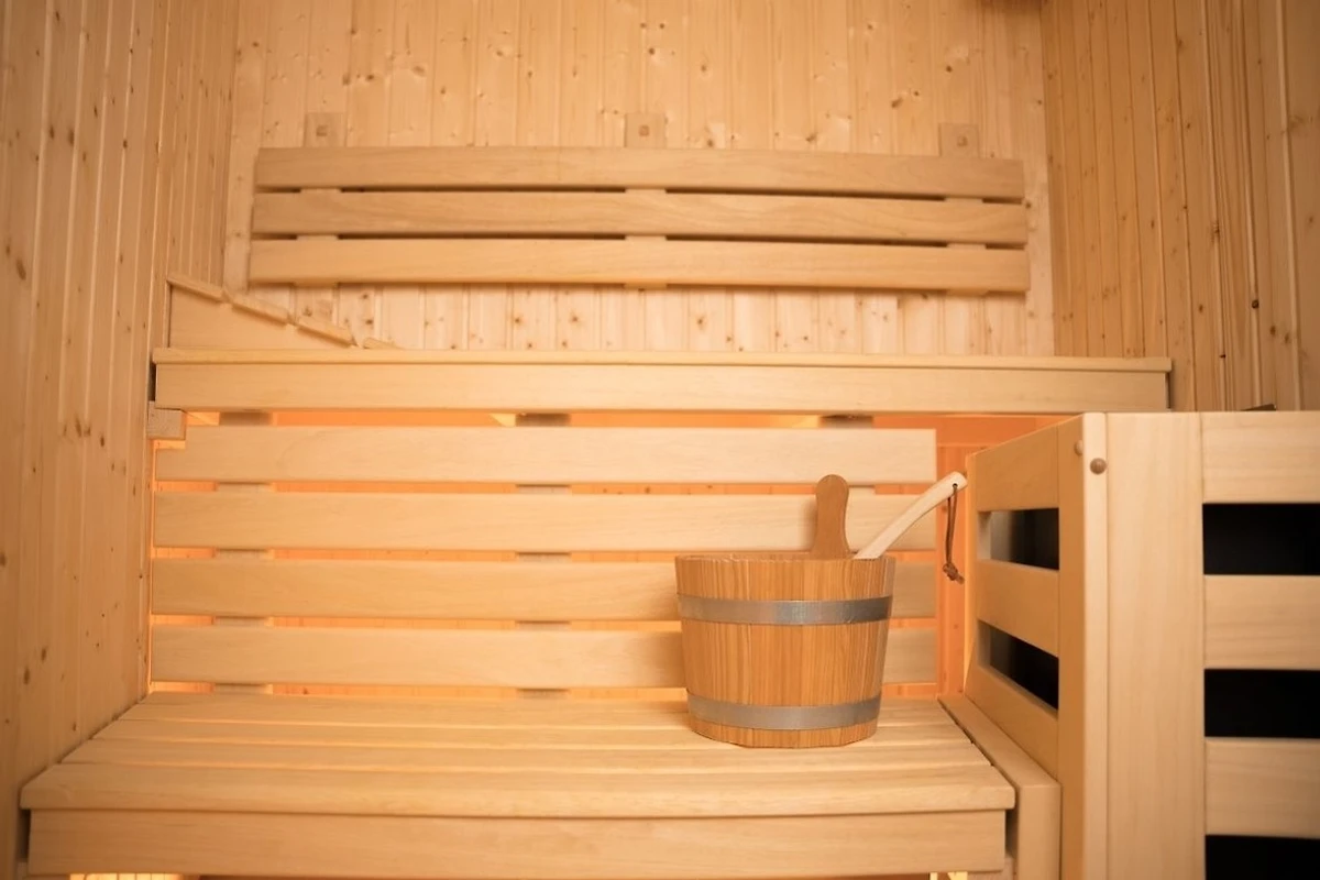 An sonnigen Tagen bietet die grosse Terrasse mit Gartenmöbeln und Sonnenschirm einen schönen Blick in die herrliche Gartenanlage. Ein geräumiges Bad mit Walk-in-Dusche und eine Sauna runden das Angebot im Erdgeschoss ab. Auf der Empore im Obergeschoss findet sich ein kuscheliger Sitzsack aus Samt, auf dem man herrlich entspannen und Sonne, Mond und Sterne beobachten kann.
