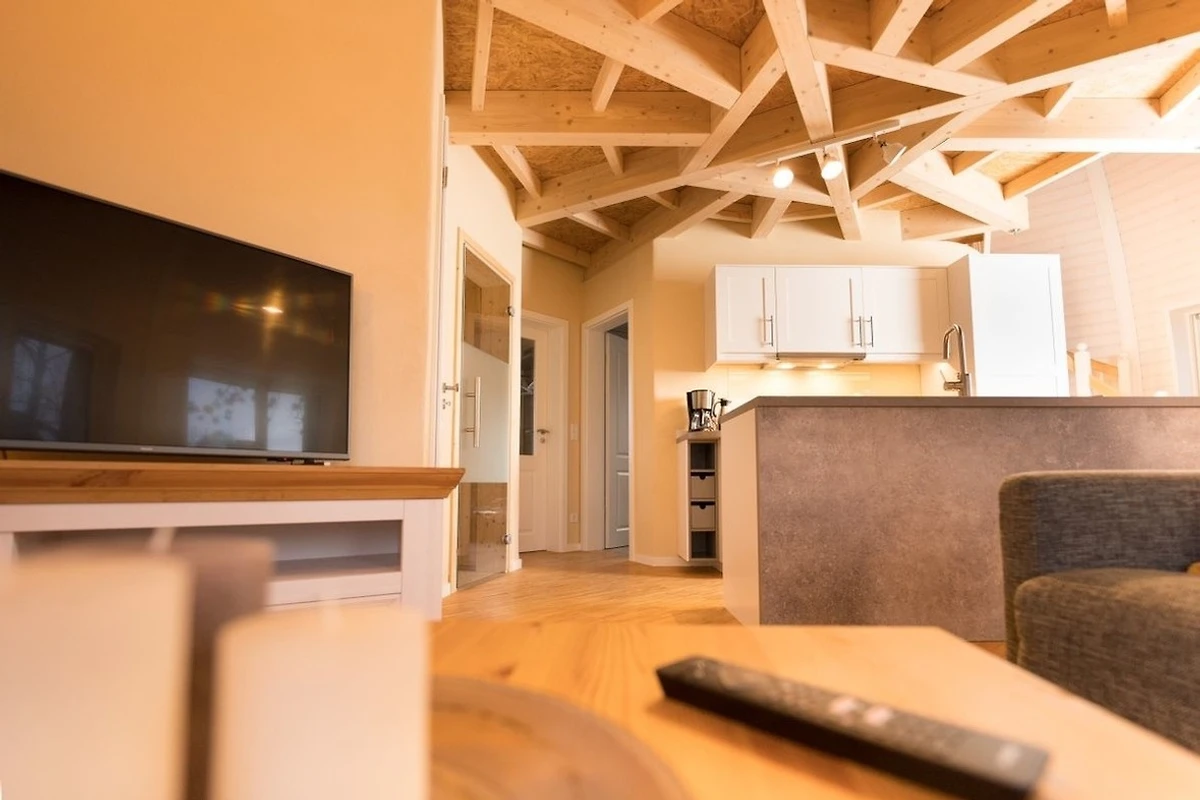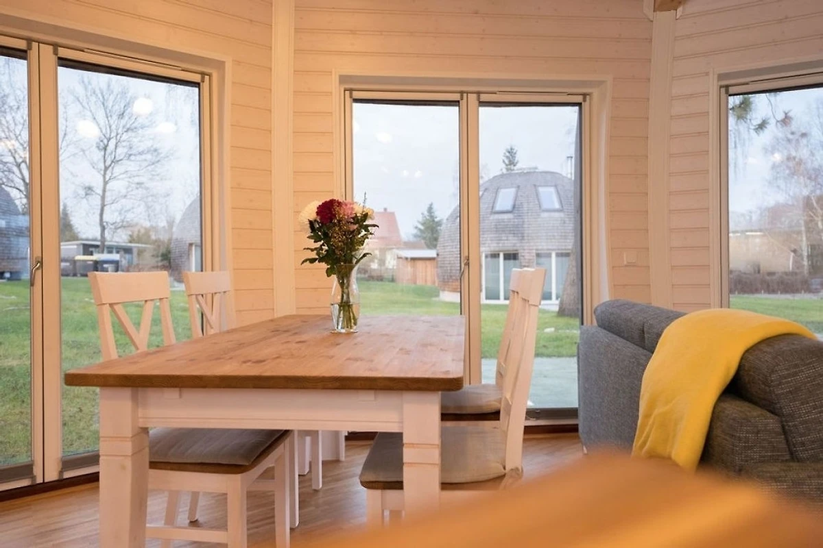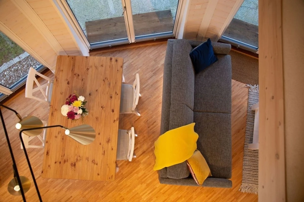 Das Kugelhaus „Chiara“ gefällt durch seine gemütliche Einrichtung im Landhausstil; verschiedene Designer-Leuchten in Gold setzen dazu kontrastierende Akzente. Auf dem grossen Sofa ist genug Platz für den Fernsehabend mit der ganzen Familie, in der gut ausgestatteten Küche können sich ambitionierte Hobbyköche entfalten, und der Holzofenkamin lädt in der kalten Jahreszeit zum Geniessen und Träumen ein.