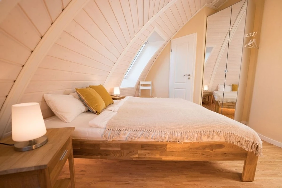 Die grossen Veluxfenster in den beiden Schlafzimmern sind mit Licht- und Wärmeschutz-Rollos ausgestattet, sodass es sich unterm Kugeldach ruhig und komfortabel schlafen lässt. Sehr praktisch ist ausserdem das kleine Bad mit Waschbecken und WC im Obergeschoss.