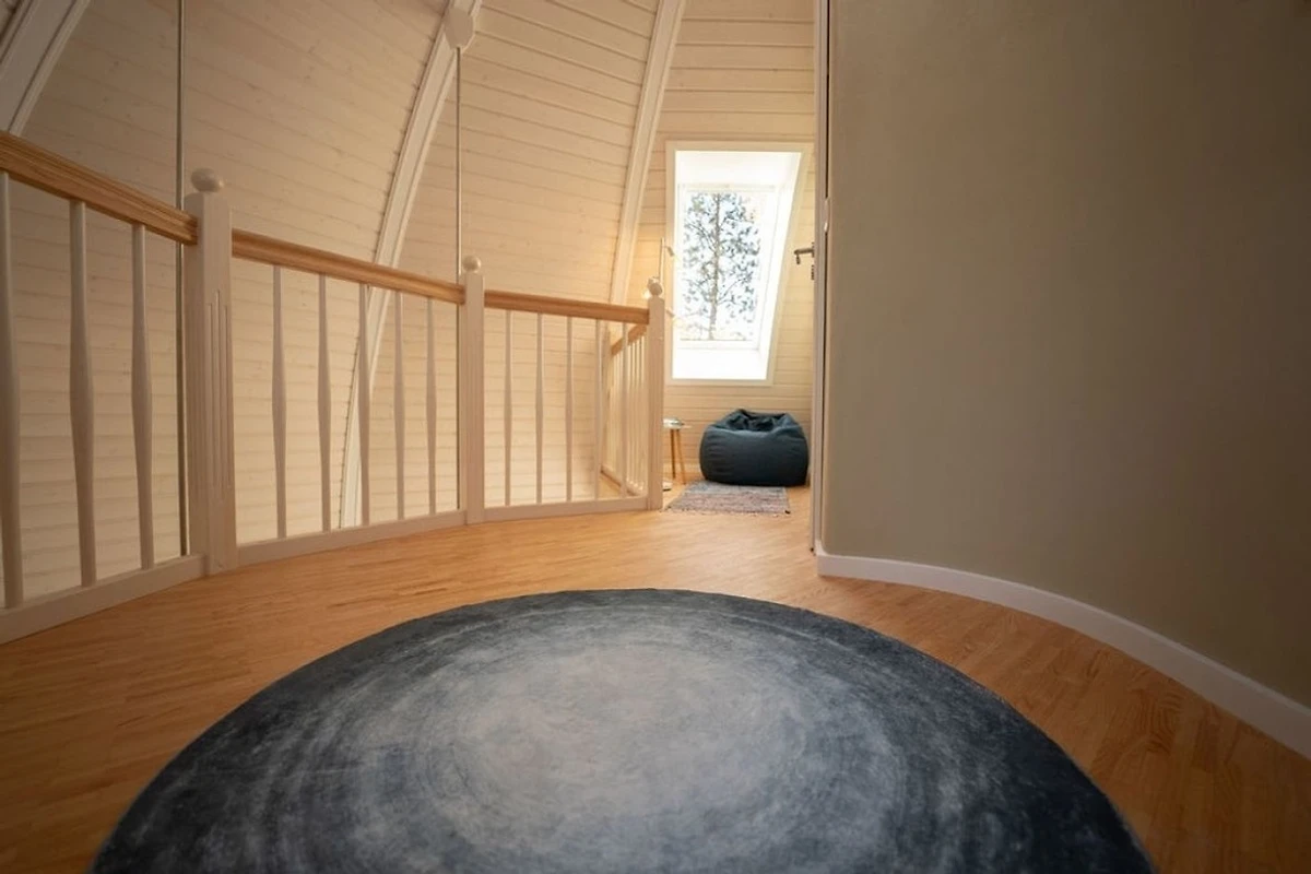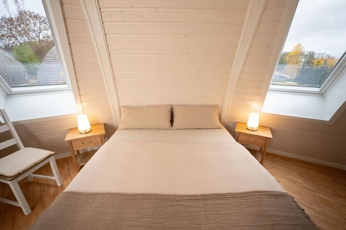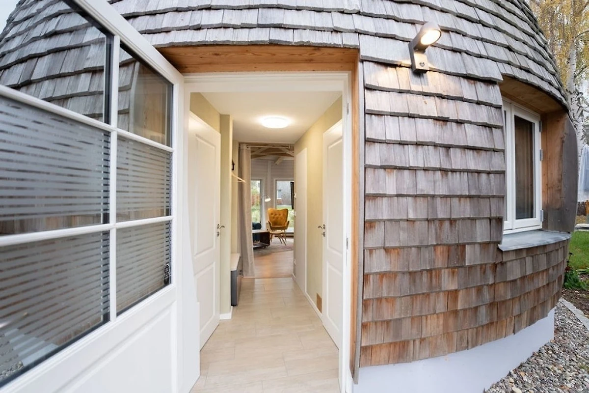 Zwei bis maximal vier Gäste nimmt dieses individuelle Kugelhaus am See auf zwei Etagen auf.