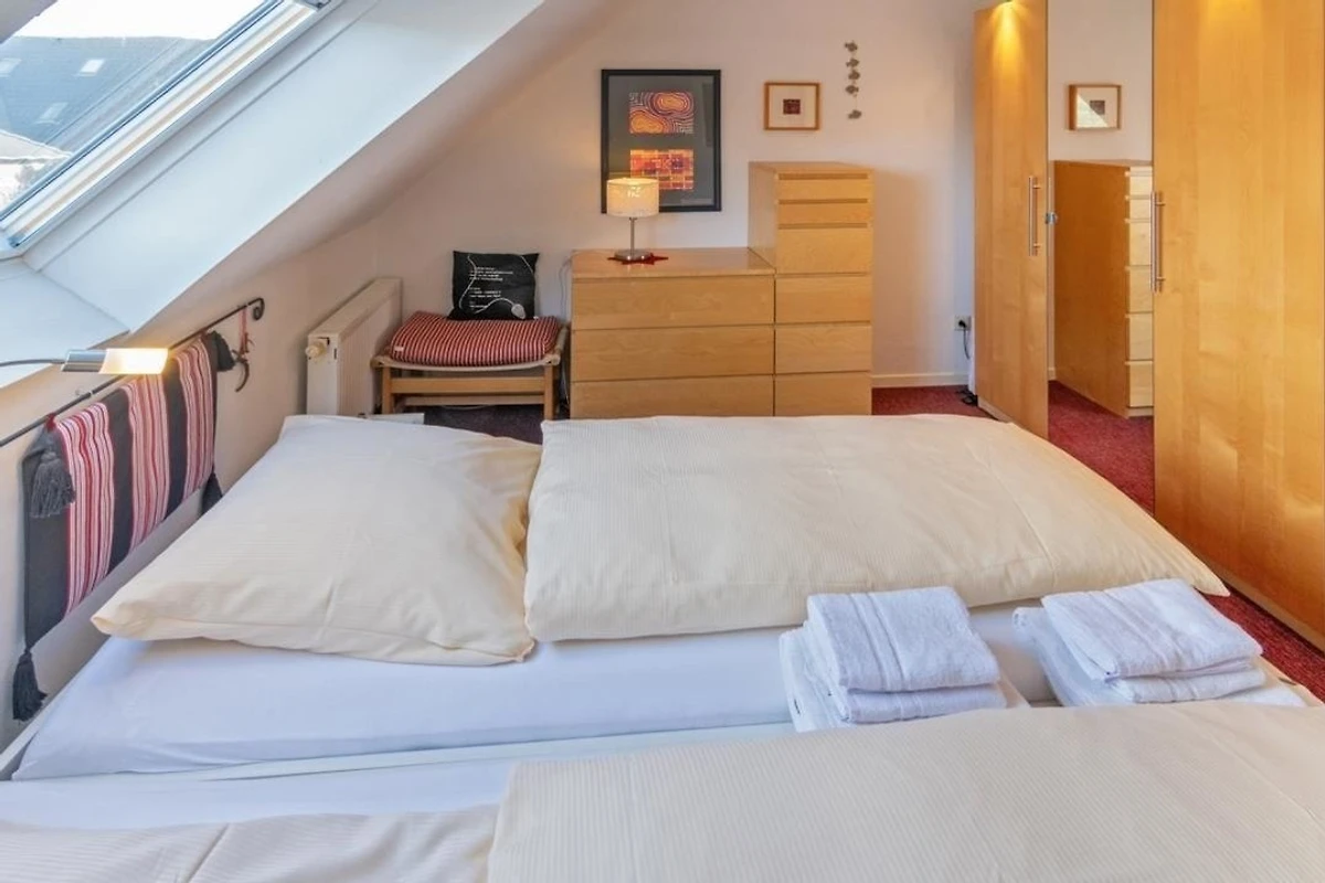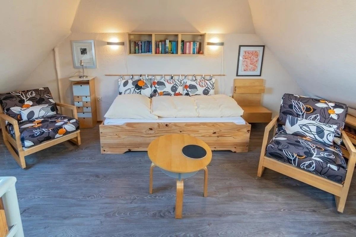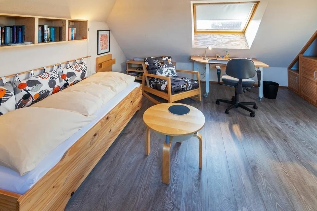 Das zweite Schlafzimmer befindet sich im ausgebauten Dachboden des Hauses und ist über eine schmale Wendeltreppe erreichbar. Hier erwartet Sie ein Einzelbett mit Standardmass, ein kleiner Kleiderschrank, zwei Sessel und ein Schreibtisch. Es eignet sich hervorragend als Kinderzimmer.